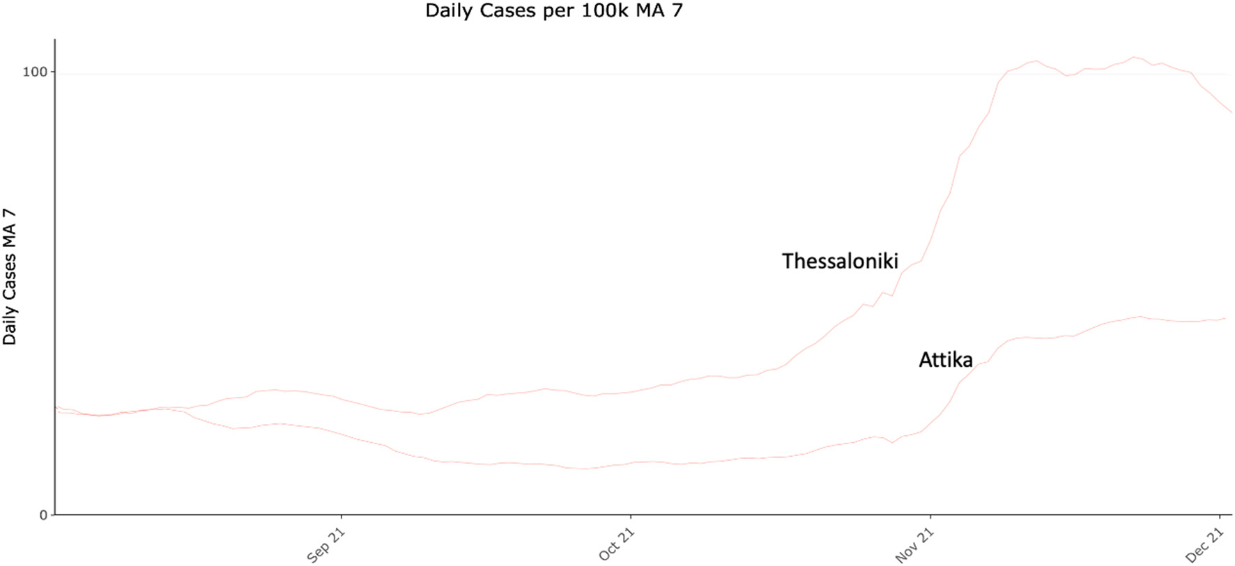 COVID-19 daily cases (7-day moving average) per 100.000 residents in Attika and Thessaloniki between August and December 2021.