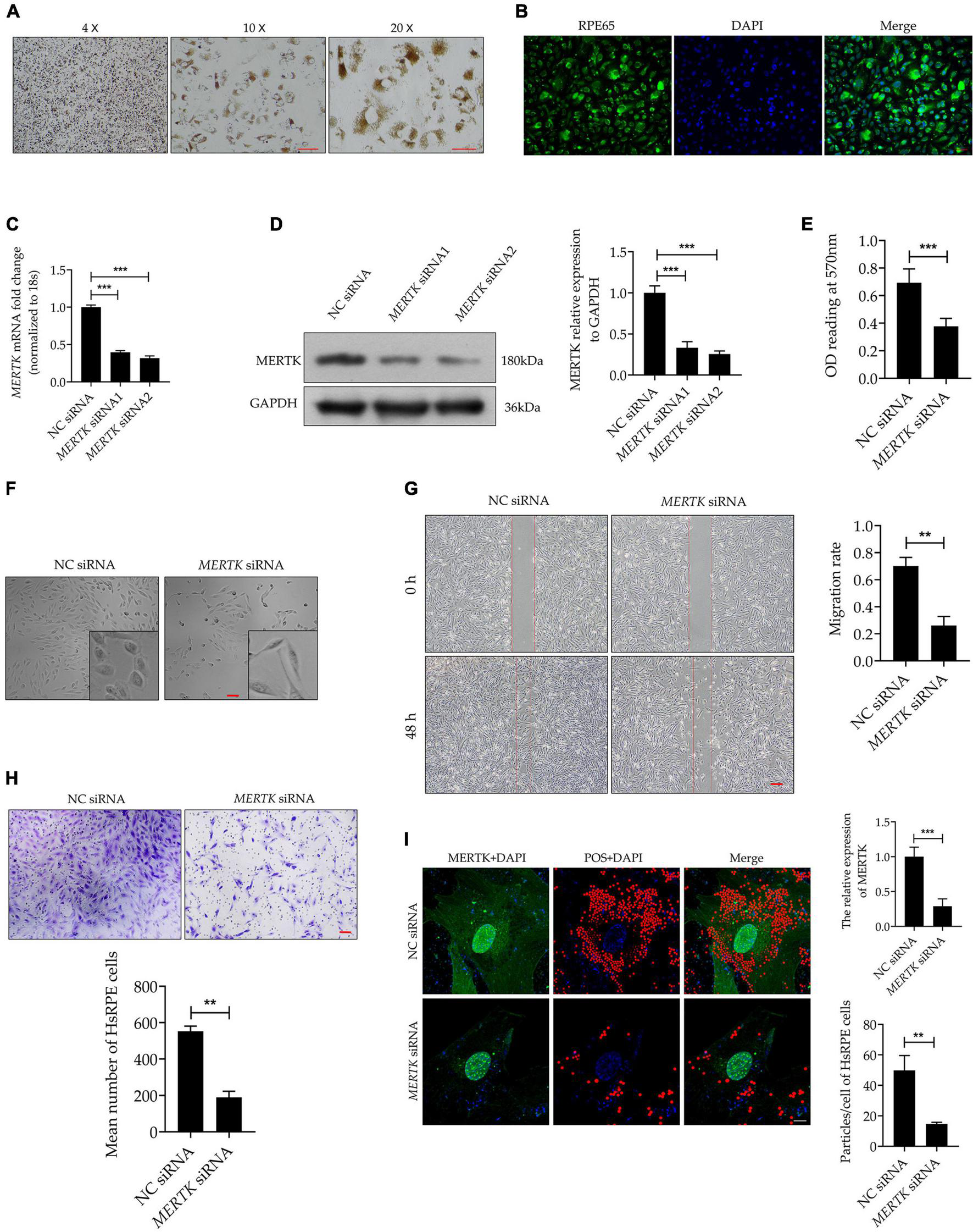 MERTK siRNA inhibited cell proliferation and induced morphological changes and phagocytic dysfunction in HsRPE cells. (A) The primary cultured HsRPE cells were observed with an inverted microscope at different magnifications (4X, 10X, and 20X). Scale bars: white bar 100 μm; red bars 10 μm. (B) The HsRPE cells were identified by immunofluorescence staining with RPE65 antibody. Scale bars: 50 μm. (C) HsRPE cells were treated with NC, MERTK siRNA1, or MERTK siRNA2 (20 nM) for 24 h, and the expression of MERTK was analyzed by RT-PCR. (D) HsRPE cells were treated with NC, MERTK siRNA1, or MERTK siRNA2 (20 nM) for 48 h, and MERTK expression was determined by Western blotting. (E) HsRPE cells were treated with NC or MERTK siRNA2 (MERTK siRNA) for 48 h, and cell proliferation was analyzed by CCK8. (F) HsRPE cells were treated the same as in (E), and cell morphology was observed with an inverted microscope. Scale bars: 100 μm. (G) HsRPE cells were treated the same as in (E), and wound-healing assays were performed to assess the wound-healing capabilities of HsRPE cells. Scale bars: 200 μm. (H) HsRPE cells were treated the same as in (E), and Transwell assays were performed to evaluate the migration activity of HsRPE cells (purple). Scale bars: 100 μm. (I) HsRPE cells were treated the same as in (E), and their phagocytic ability was examined using phagocytosis assays. The red dots represent the particles and the green dye represents the MERTK protein. Scale bars: 5 μm. **P < 0.01; *** P < 0.001.