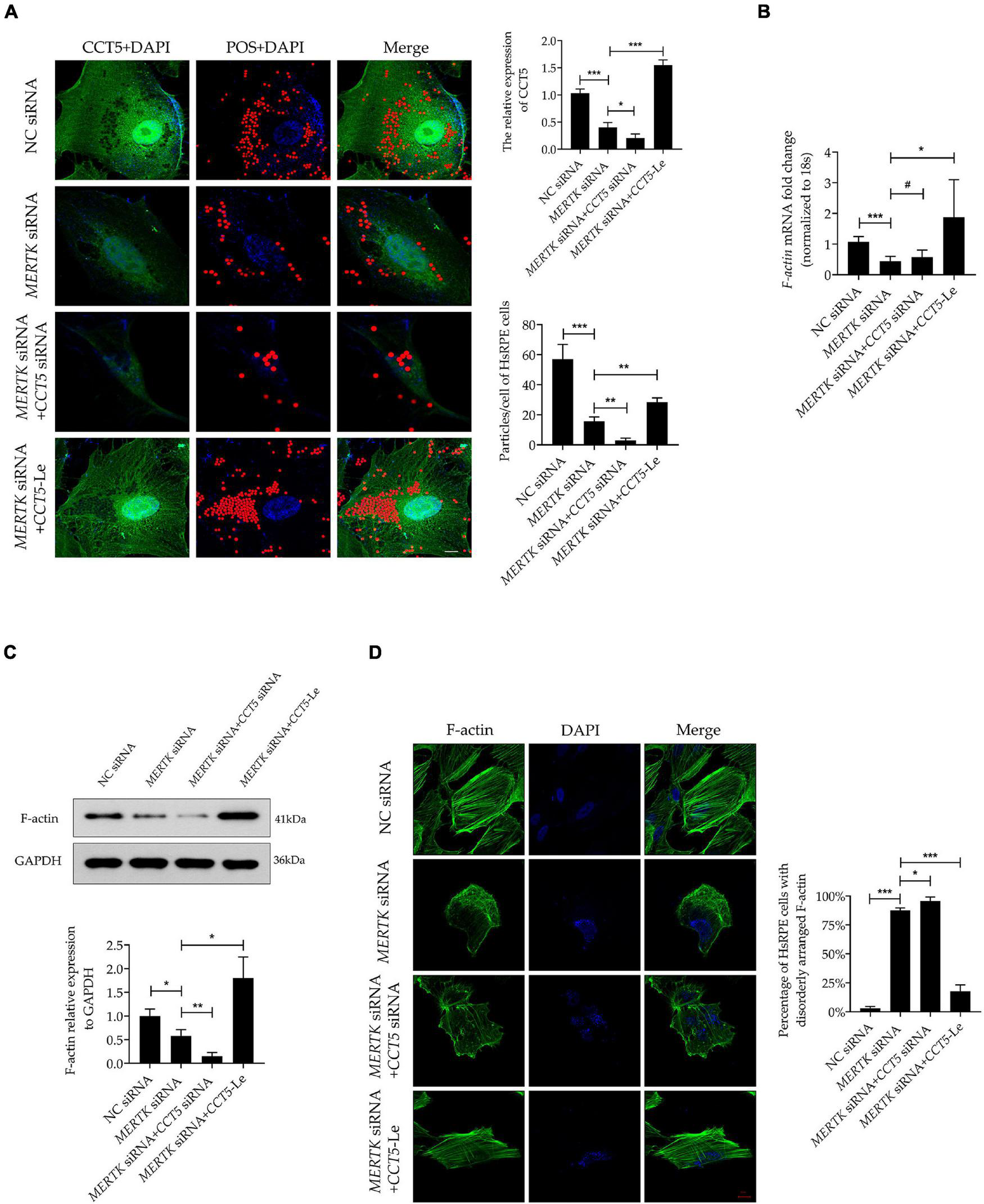 To investigate the function of CCT5-Le in the phagocytic process of HsRPE cells, we performed the phagocytosis assay combined with the immunofluorescence assay. The MERTK siRNA group exhibited a significantly decreased expression of CCT5 (green) and a significantly decreased quantity of red particles that were phagocytized into the HsRPE cells, as compared with the NC siRNA group. In the MERTK siRNA + CCT5 siRNA group, the expression of CCT5 was further decreased and the number of red particles phagocytized into HsRPE cells was further reduced compared with that in the MERTK siRNA group. By contrast, the MERTK siRNA + CCT5-Le group exhibited a significantly increased CCT5 expression and quantity of red particles phagocytized into HsRPE cells compared with the MERTK siRNA group (Figure 4A). To investigate whether CCT5-Le rescued the phagocytic function via the regulation of F-actin, the expression of F-actin was then examined. Our results indicate that MERTK siRNA significantly decreased the expression of F-actin at both the mRNA and protein levels, as compared with that in the NC group. In the MERTK siRNA + CCT5 siRNA group, the expression of F-actin was decreased further compared with that in the MERTK siRNA group. However, in the MERTK siRNA + CCT5-Le group, F-actin expression was significantly increased, compared with that in the MERTK siRNA and MERTK siRNA + CCT5 siRNA groups (Figures 4B,C). Furthermore, to detect whether CCT5-Le restored the distribution and arrangement of F-actin, we performed the immunofluorescence analysis. In the MERTK siRNA + CCT5 siRNA group, the distribution and arrangement of F-actin became more irregular than that in the MERTK siRNA group. However, in the MERTK siRNA + CCT5-Le group, the distribution and arrangement of F-actin were recovered, as seen in the NC group (Figure 4D). These results indicate that the upregulation of CCT5 expression rescued the phagocytic function, which was disrupted by MERTK siRNA, by restoring the expression and organization of F-actin in HsRPE cells.