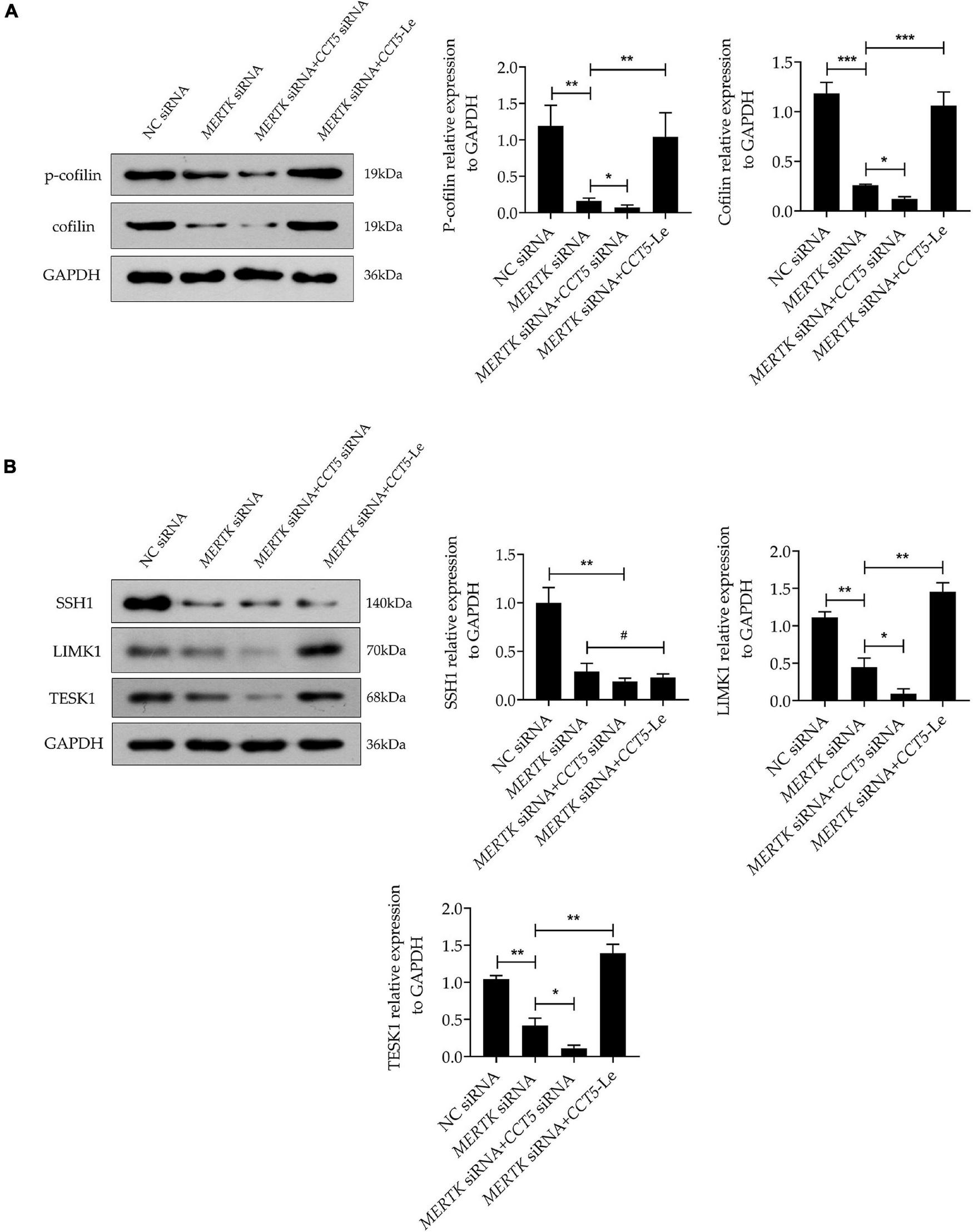 Phosphorylated cofilin (p-cofilin) and cofilin are essential regulators of F-actin dynamics, regulating the polymerization and depolymerization of F-actin in the processes of phagocytosis and migration. To determine whether cofilin and p-cofilin were involved in CCT5-Le’s rescue of the phagocytosis and migration function of HsRPE cells with MERTK-associated RP, we next determined their levels of expression. Notably, we found that the expression of both cofilin and p-cofilin was suppressed in the MERTK siRNA group compared with that in the NC group. In the MERTK siRNA + CCT5 siRNA group, the expression of both cofilin and p-cofilin was decreased further when compared with that in the MERTK siRNA group. However, in the MERTK siRNA + CCT5-Le group, the expression of both cofilin and p-cofilin was increased compared with that in the MERTK siRNA and MERTK siRNA + CCT5 siRNA groups (Figure 5A). Cofilin is inactivated via phosphorylation by LIM-kinase 1 (LIMK1) and testicular protein kinase 1 (TESK1) and reactivated via dephosphorylation by slingshot 1 (SSH1). Therefore, to investigate whether LIMK1, TESK1, and SSH1 regulated the activity of cofilin in the process of CCT5-Le’s rescue of the phagocytosis and migration function of HsRPE cells under MERTK-associated RP, we detected the expression of LIMK1, TESK1, and SSH1. The results indicate that the expression of LIMK1, TESK1, and SSH1 was decreased in the MERTK siRNA group, compared with that in the NC group. However, in the MERTK siRNA + CCT5 siRNA group, only the expression of LIMK1 and TESK1, and not SSH1, was further decreased compared with that in the MERTK siRNA group. In the MERTK siRNA + CCT5-Le group, the expression of LIMK1 and TESK1 was increased, but the expression of SSH1 again demonstrated no significant change compared with that in the MERTK siRNA and MERTK siRNA + CCT5 siRNA groups (Figure 5B). These results indicate that CCT5-Le rescued the phagocytosis and migration function which were destroyed by MERTK siRNA via the LIMK1/cofilin, but not the SSH1/cofilin, pathway.