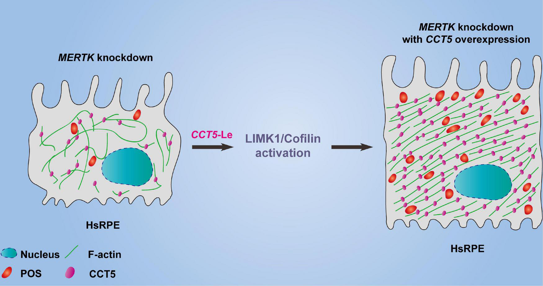 In summary, despite the abovementioned limitations, our results demonstrate, for the first time, that the cell proliferation, migration, and phagocytic function of RPE cells are inhibited by MERTK-associated RP due to the abnormal expression of F-actin and disruption of its regular arrangement. Importantly, our findings reveal that CCT5 interacts with F-actin and regulates its expression and arrangement. Upregulating CCT5 protects against the effect of MERTK knockdown in RPE cells through its interactions with F-actin and activation of the LIMK1/cofilin pathway. These findings provide a new perspective for research into the mechanisms underlying MERTK-associated RP and provide a new direction for future studies of the molecular mechanisms of RP pathogenesis.