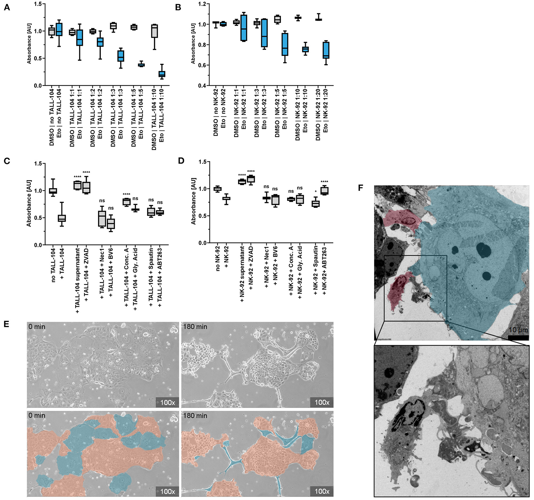 Co-incubation of senescent cells and immune cells. (A,B) CRV absorbance of remaining adherent cells after co-incubation of senescent Caco-2 cells and immune cells. Co-incubation with TALL-104 (A) or NK-92 (B) immune cells lead to dose-dependent elimination of senescent cells. (C,D) Elimination of senescent cells under the influence of immune cell conditioned supernatant and various inhibitors of cellular clearance mechanisms as measured by CRV absorbance. TALL-104 (C) and NK-92 (D) experiments are shown. *p ≤ 0.05, **p ≤ 0.01, ***p ≤ 0.001, ****p ≤ 0.0001, ns = not significant. (E) Life cell imaging of co-incubation of senescent cells and immune cells. Specific elimination of senescent cells (blue) by NK-92 cells while proliferating cells (orange) are spared. (F) Electron microscopy. Cell-cell contact of TALL-104 cells (red) and a senescent cell (blue).