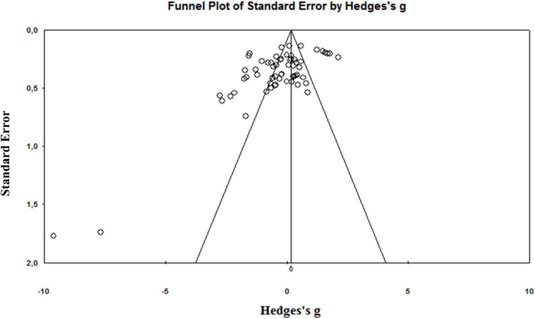 Funnel plot of the standard differences in means vs. standard errors for all included effect sizes.