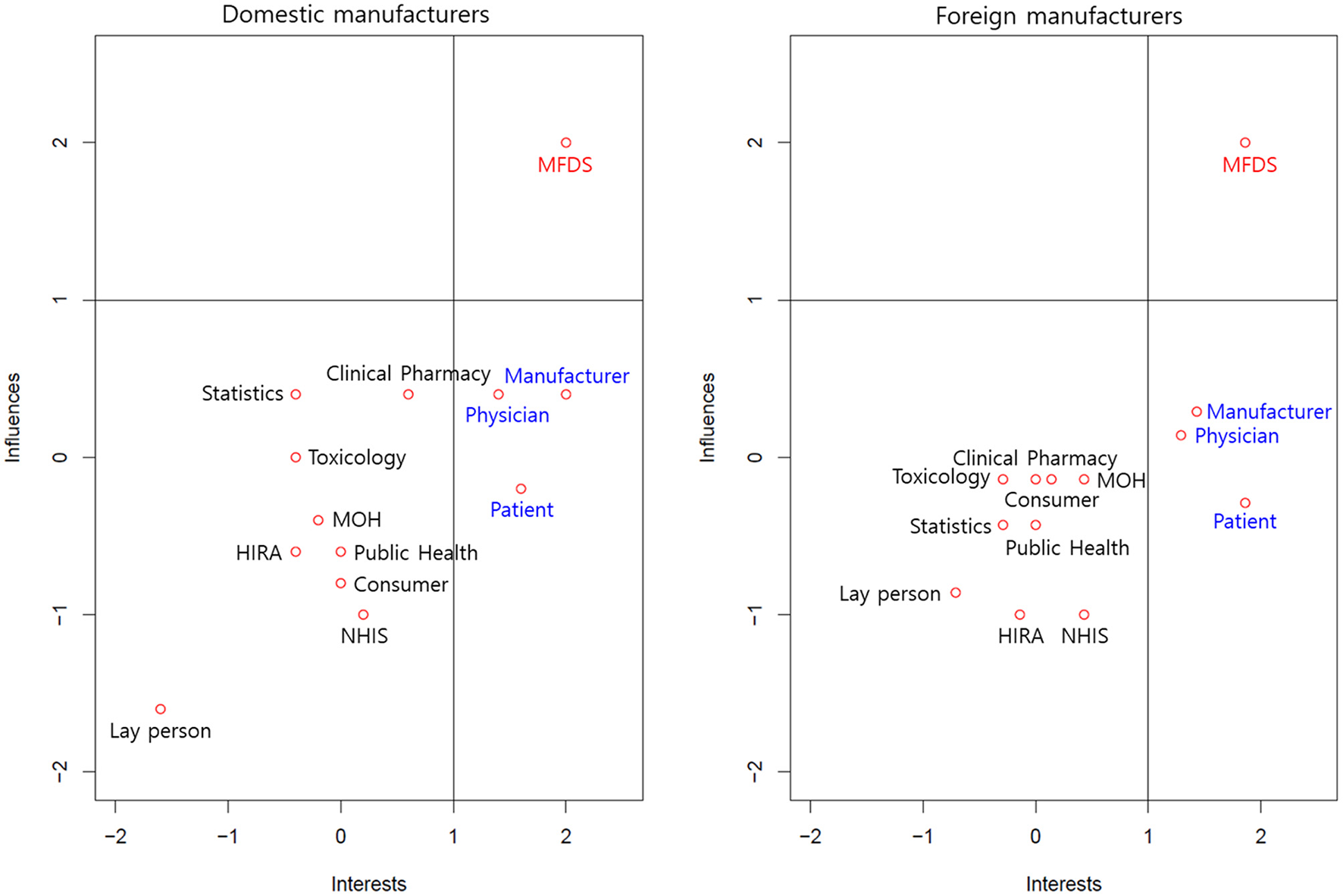 Figure 1 describes the perceived interests and influences of various stakeholders in regulatory decision-making. We defined a value rated more than 1 point as strong and categorized the 13 stakeholders into three groups: the group with strong interests and strong influences; the group with strong interests but weak influences; and the group with weak interests and weak influences. The manufacturers perceived the MFDS as a sole group with strong interests and strong influences. Similarly, they perceived manufacturers, physicians, and patients as a group with strong interests but weak influences. The remaining stakeholders were described as a group with weak interests and weak influences. Interestingly, the manufacturers perceived laypersons as a group with the weakest interests and influences.
