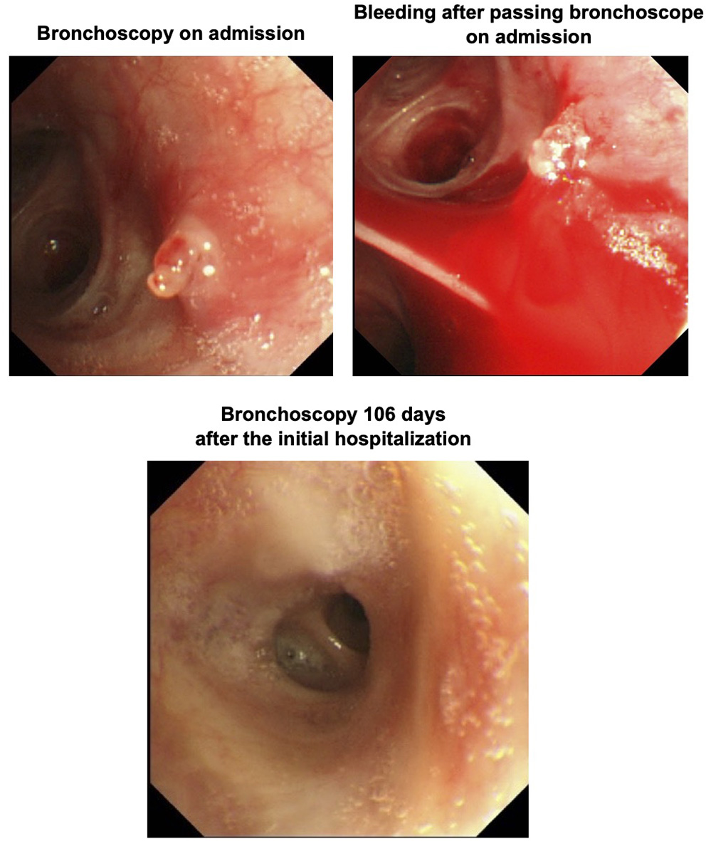Bronchoscopy performed on the day of admission showed a polypoid elevated lesion at the bifurcation of the left upper lobe (upper left panel). Passage of bronchoscope revealed pulsatile bleeding around the polypoid lesion (upper right panel). Bronchoscopy performed 106 days after the initial hospitalization revealed that the elevated lesion completely disappeared (lower panel).