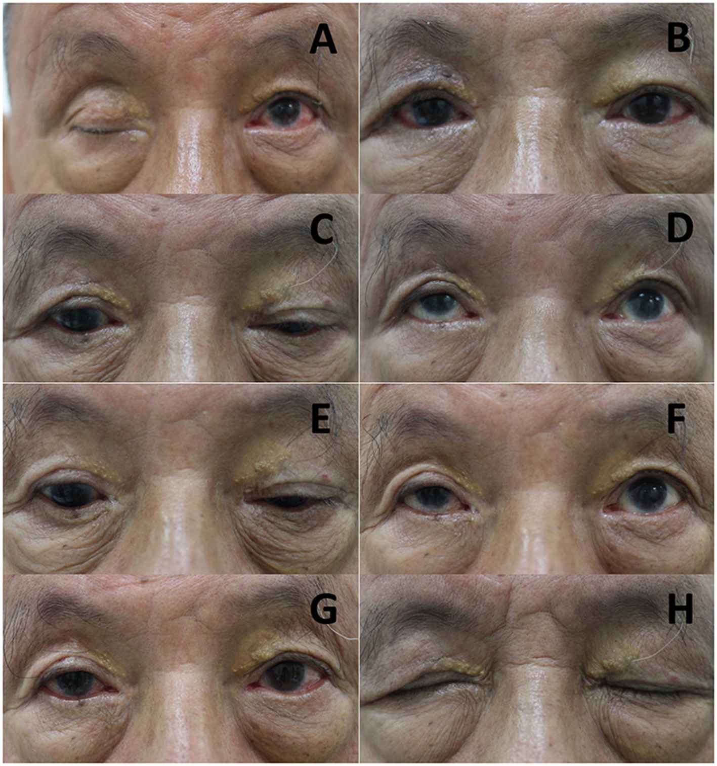 Serial photos of Case 1 before and after frontalis-orbicularis oculi muscle (FOOM) flap shortening surgery and injection of botulinum toxin-A. (A) Photos were taken before and (B) 3 months after FOOM flap shortening, respectively. (C,D) The FOOM flap function (upper eyelid excursion) of the right eye was about 4 mm 1 year after FOOM flap shortening. (E,F) The FOOM flap function was reduced to nearly 0 mm 1 week after the injection of botulinum toxin-A with 5 units at the central supra-brow area, which was supposed to be the area around the origin of the FOOM flap. (G) 1 week after the injection, he developed blepharoptosis. (H) The patient could close his eyes completely without lagophthalmos.