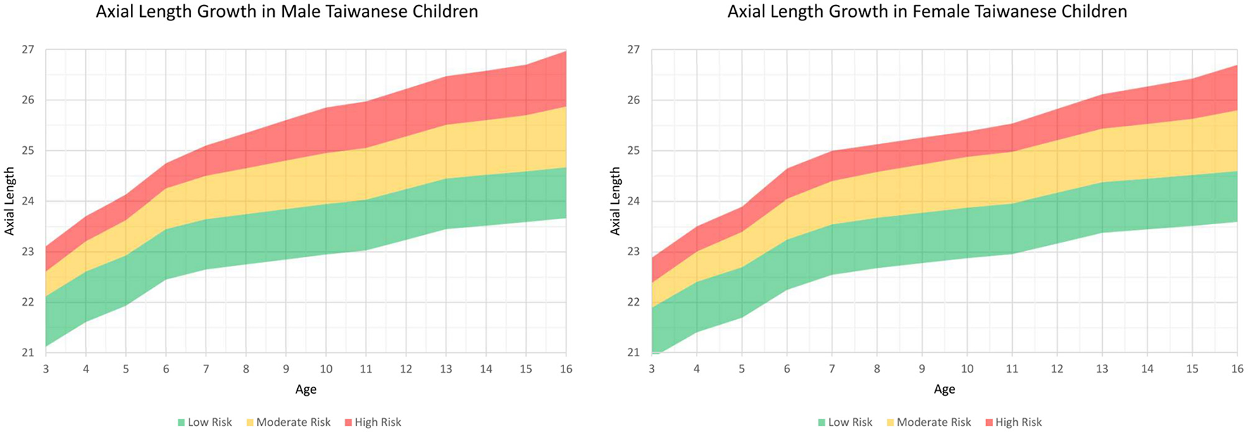 Axial length growth chart among Taiwanese children separated by sex from the first part of this study. The charts were further subclassified the percentiles into three risk categories: below the 50th percentile, low risk (green color); 50th to 90th percentile, moderate risk (yellow color); and above the 90th percentile, high risk (red color).