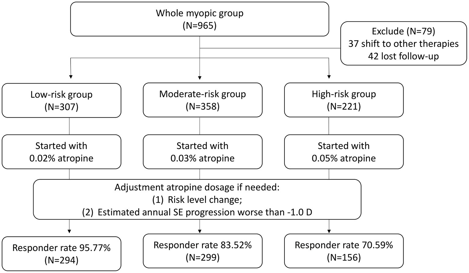 In conclusion, we conducted a two-stage approach to control myopia progression with different concentrations of low-dose atropine based upon risk classification. With this individualized approach, we achieved a non-inferior result compared to other studies applying a single concentration of low-dose atropine in generally myopic children.