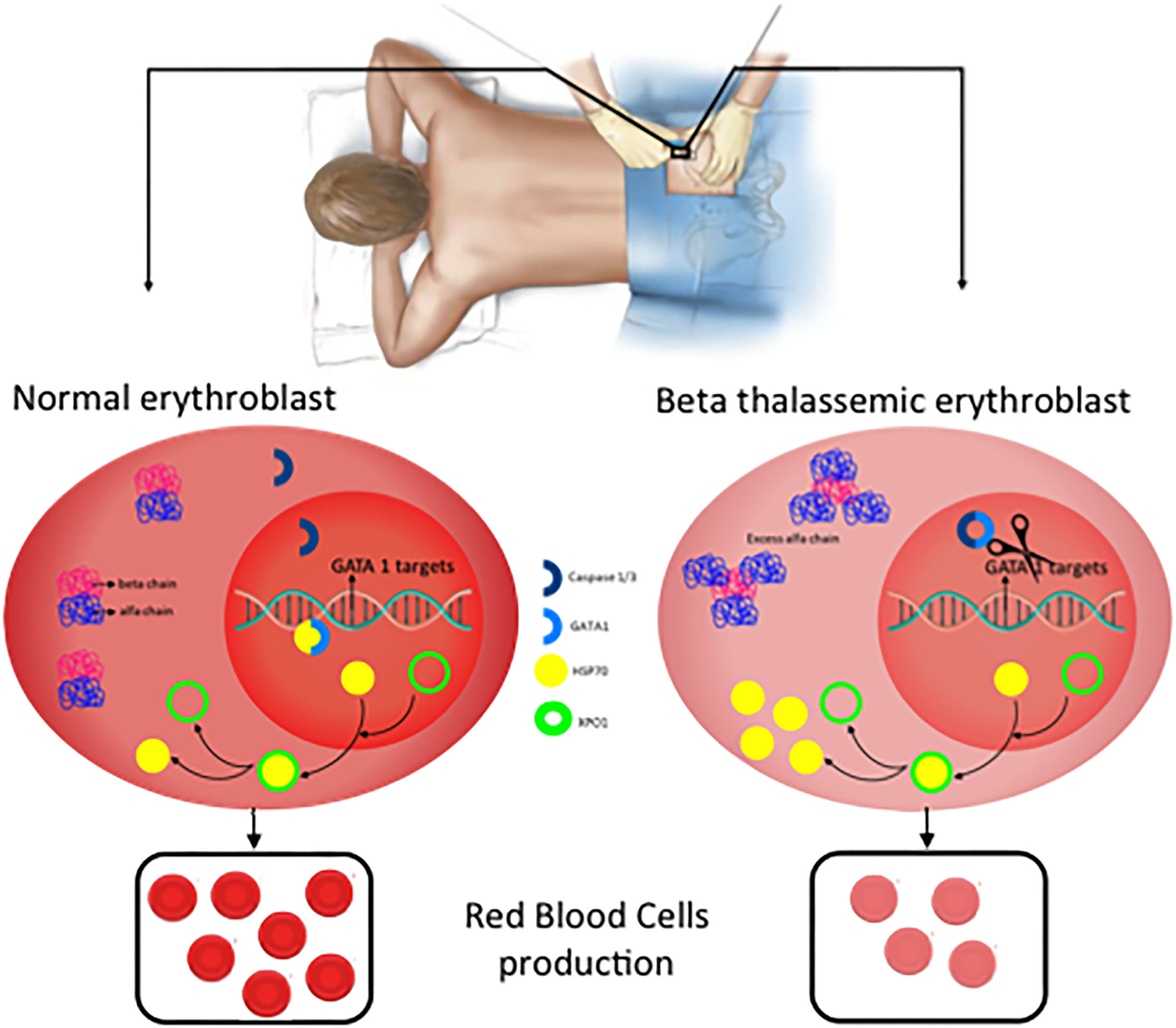 In human erythroblast, terminal erythroid maturation is altered due to HSP70 sequestration in the cytoplasm by free α-globin chains preventing its accumulation in the nucleus to protect GATA1 transcription factor from Caspase-3 cleavage, resulting in maturation arrest and apoptosis. ERFE and BMP play an important role in bone disease but are not well-established yet.