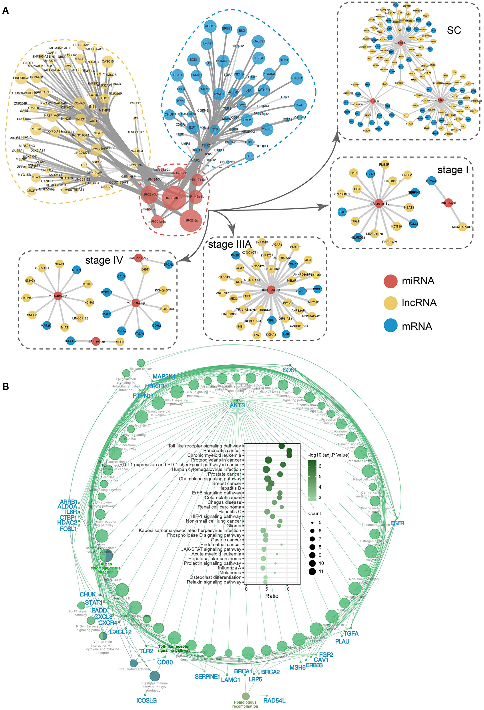 First, target genes and screened CRC-related genes were identified for all SS exo-miRNAs obtained based on 11 databases, and an SS miRNA-target network was constructed (Figure 7A). Subsequently, the CRC-related genes of each stage were identified by Venn diagram (Figure 7B), and finally, five SS CRC miRNA-target sub-networks were obtained (stage IV, Figure 7C; stage I, Figure 7D; stage II, Figure 7E; stage IIIA, Figure 7F; stage IIIB, Figure 7G). Additionally, GO and KEGG enrichment analyses were performed to explore the role of different SS subnetworks in CRC development.
