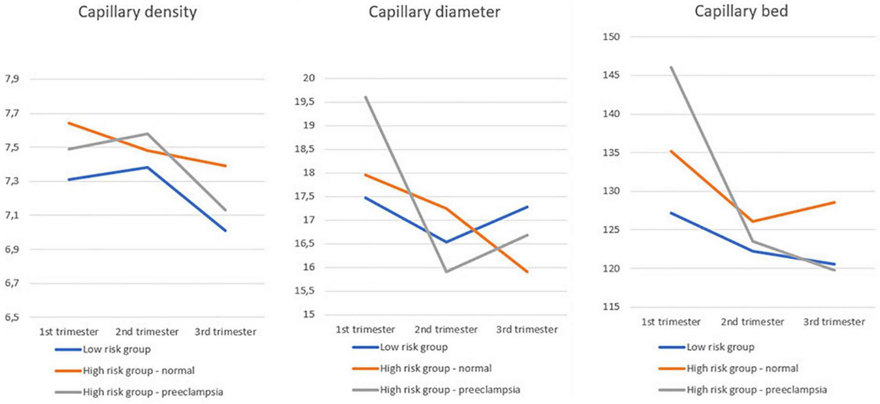 Nailfold video capillaroscopy (NVC) measurements were performed at magnification of 200x at all fingers except thumbs. Images were stored for offline measurement of capillary density (CDe) and capillary diameters (CDi). Maternal anthropometrics, obstetric, and medical history were used for categorization in low and high cardiovascular risk. Comparison between groups and trimesters, with respect to pregnancy outcome, was performed using linear mixed model analysis.