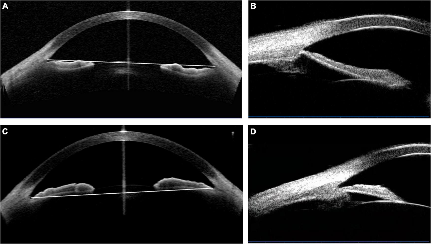 The determination of the concave and convex iris shape based on the anterior-segment optical coherence tomography (AS-OCT) or ultrasound biomicroscopy (UBM) images. (A,B) Concave shape iris: most part of iris locating behind angle-to-angle (ATA) with a concave shape of the iris pigment epithelium, referring to a “bowing” away from the cornea. And a wide sulcus could be detected in (B). (C,D) Convex shape iris: most part of iris locating before ATA with a convex shape of the iris pigment epithelium, referring to that the mid-peripheral iris pigment epithelium is “bowed” toward the cornea. Besides, convex shape iris with anteriorly positioned ciliary body was demonstrated in (D).