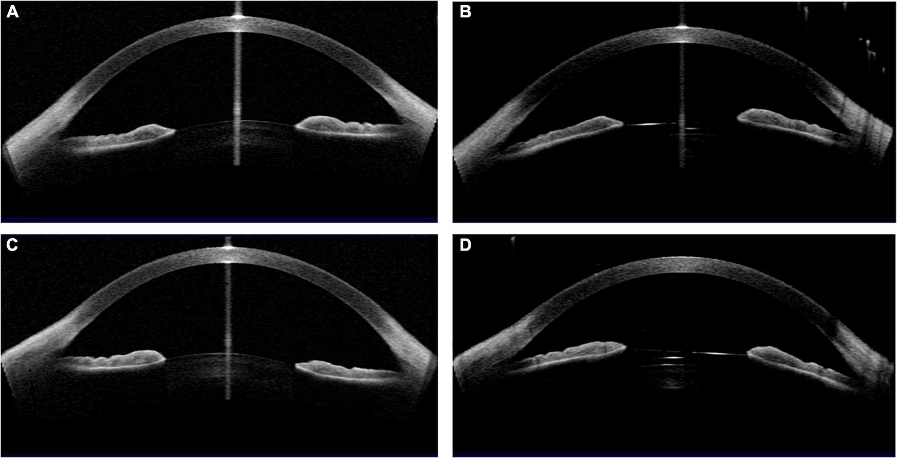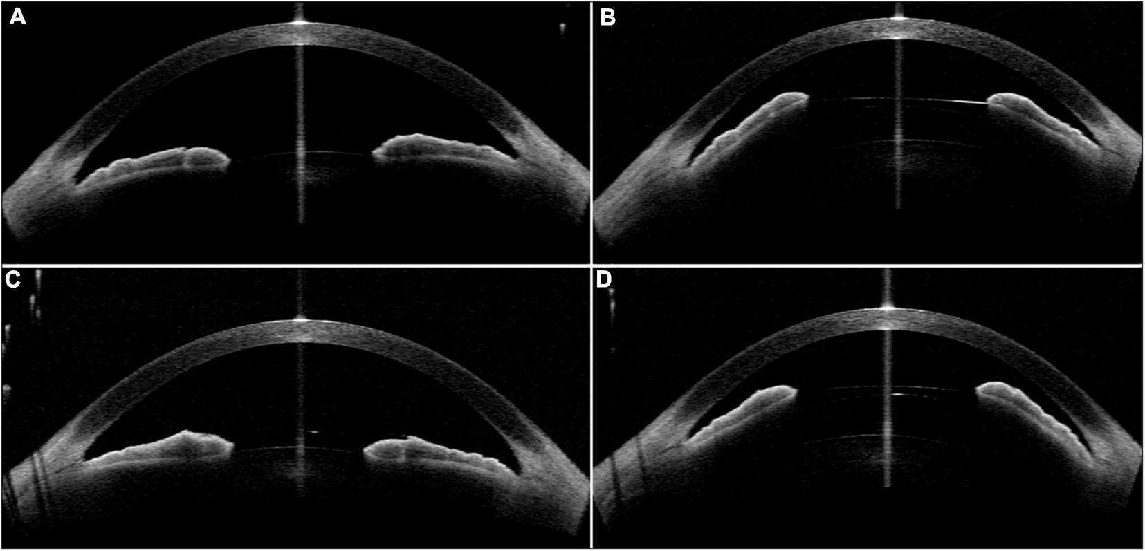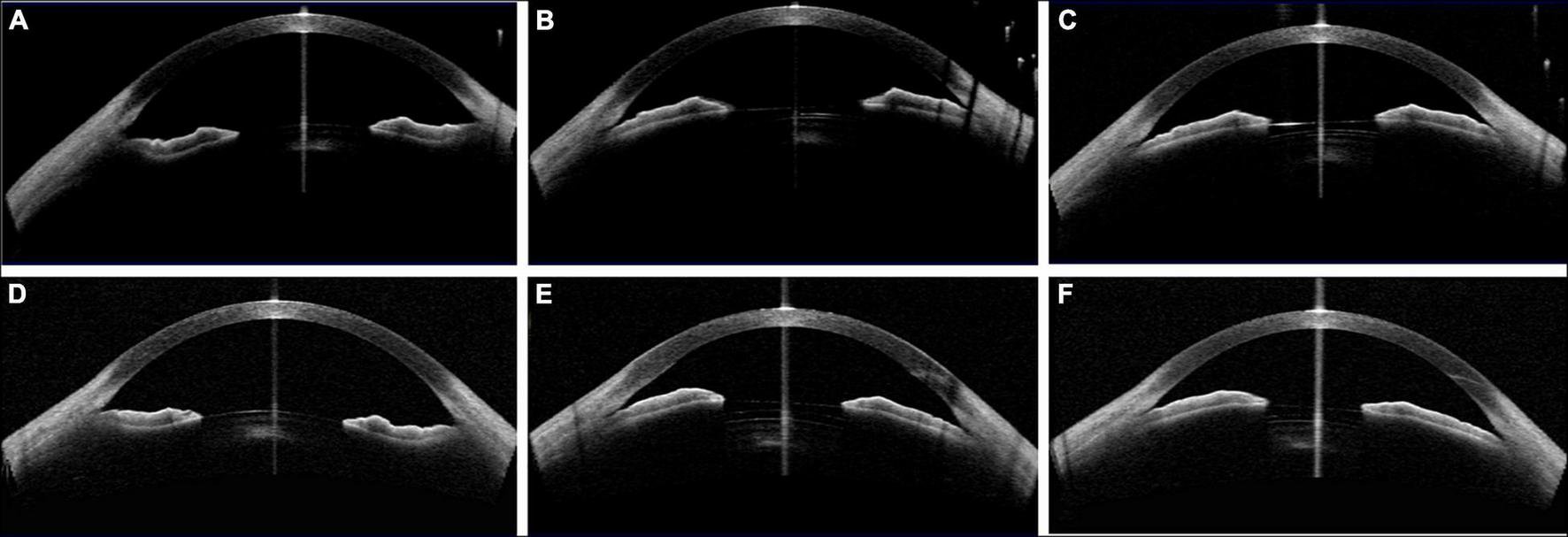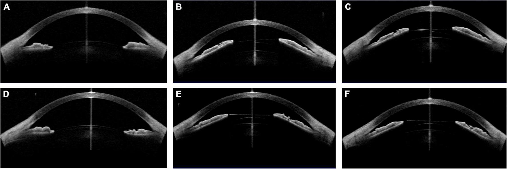 All patients underwent a complete ophthalmic examination, including uncorrected distance visual acuity (UDVA), corrected distance visual acuity (VA), manifest and cycloplegic refraction, non-contact tonometry, slit-lamp microscopy, endothelial cell density measurement, gonioscopy and funduscopic examination. The axial length (AL), LT and WTW were recorded from IOL Master 700. The angle-to-angle (ATA) distance, central corneal thickness (CCT), anterior chamber angle (ACA), and ACD were determined via AS-OCT. The STS distance was measured using UBM. UBM examinations were performed using an eyecup filled with stilled water after topical oxybuprocaine hydrochloride. The participants were required to lie down in a supine position and fixate on a ceiling target. A full view scan of the anterior segment was obtained at the 3–9 and 6–12 o’clock positions with the probe held perpendicular to the eyes. Radial scans of the limbus area through a typical process in the 2-, 4-, 8-, and 10- o’clock quadrants were also acquired. The iris shape was determined based on the UBM images. The vault value was acquired at least 1 month after the operation using AS-OCT. All patients received the examination before surgery and 1 day, 1 week, and 1 month, respectively, after the operation.