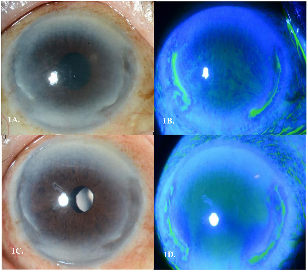 (A) Peripheral ulcerative keratitis (PUK) seen in Case 1's right eye with 2 discrete areas of severe peripheral corneal melt spanning 2 clock hours nasally and 2 clock hours temporally (B). Corresponding staining of areas of cornea melt temporally and nasally (C). Epithelization over the two areas of cornea melt by day 9 of treatment (D). Corresponding area of pooling temporally and nasally showing epithelization of the stromal melt.