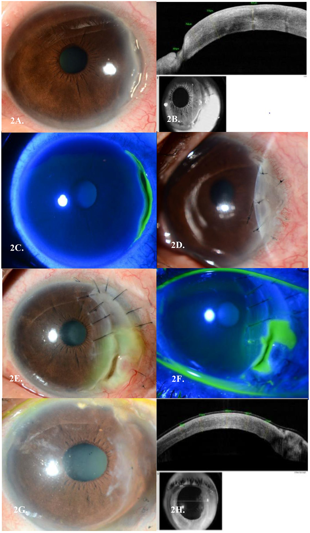 (A) Peripheral ulcerative keratitis (PUK) seen in Case 2's left eye temporally. (B) Corresponding AS-OCT cuts through the areas of thinning in each eye, respectively. (C) Corresponding staining of areas of cornea melt temporally. (D) Left Amniotic Membrane Transplant (AMT) in view of PUK progression. (E) Post repeat conjunctival recession, AMT and tectonic keratoplasty in view of PUK recurrences, with another new epithelial defect over the graft. (F) Corresponding staining of areas of cornea melt temporally over the tectonic graft. (G) Last AMT performed with no further recurrences of PUK over a 3-year follow-up period. (H) Corresponding AS-OCT cuts through the areas of thinning in each eye, respectively.