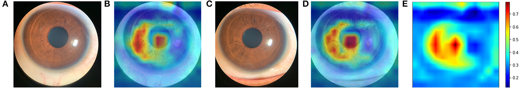 Averaged heatmap shows the regions of the anterior segment photograph that were most important for the deep learning algorithm predictions in test set. Hotter colors (reds) indicate higher activity while cooler colors (blues) represent lower activity. (A) an example of original anterior segment photograph (right eye) obtained by iPhone Xs; (B) the heatmap of the corresponding photograph; (C) an example of original anterior segment photograph (left eye); (D) the heatmap of the corresponding photograph; (E) averaged heat map crossed all images (n = 831).