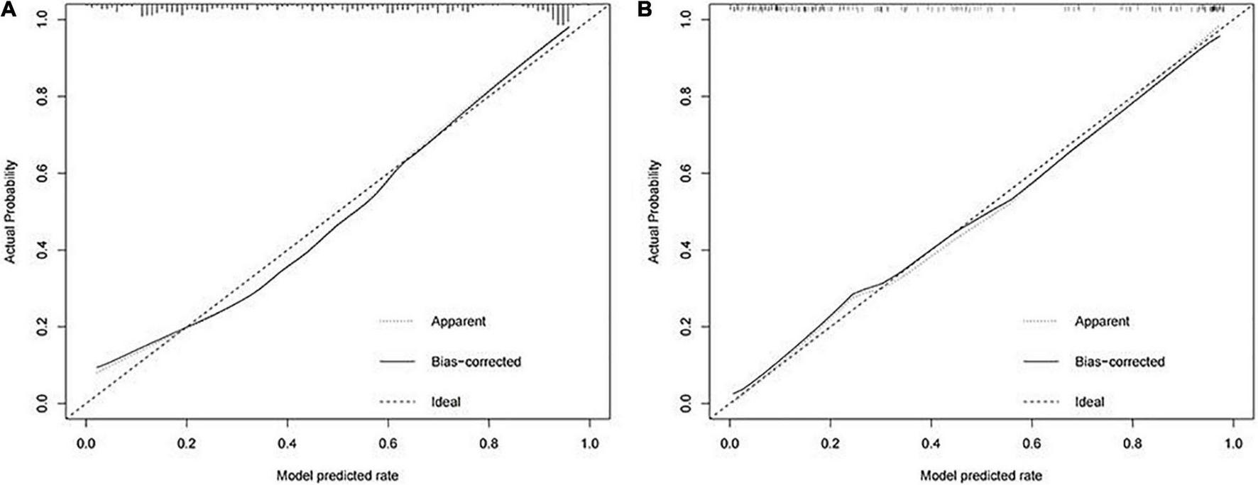 Calibration curves for predicting the onset of intestinal metaplasia and dysplasia in chronic atrophic gastritis (CAG) patients. (A) Training cohort. (B) Validation cohort.