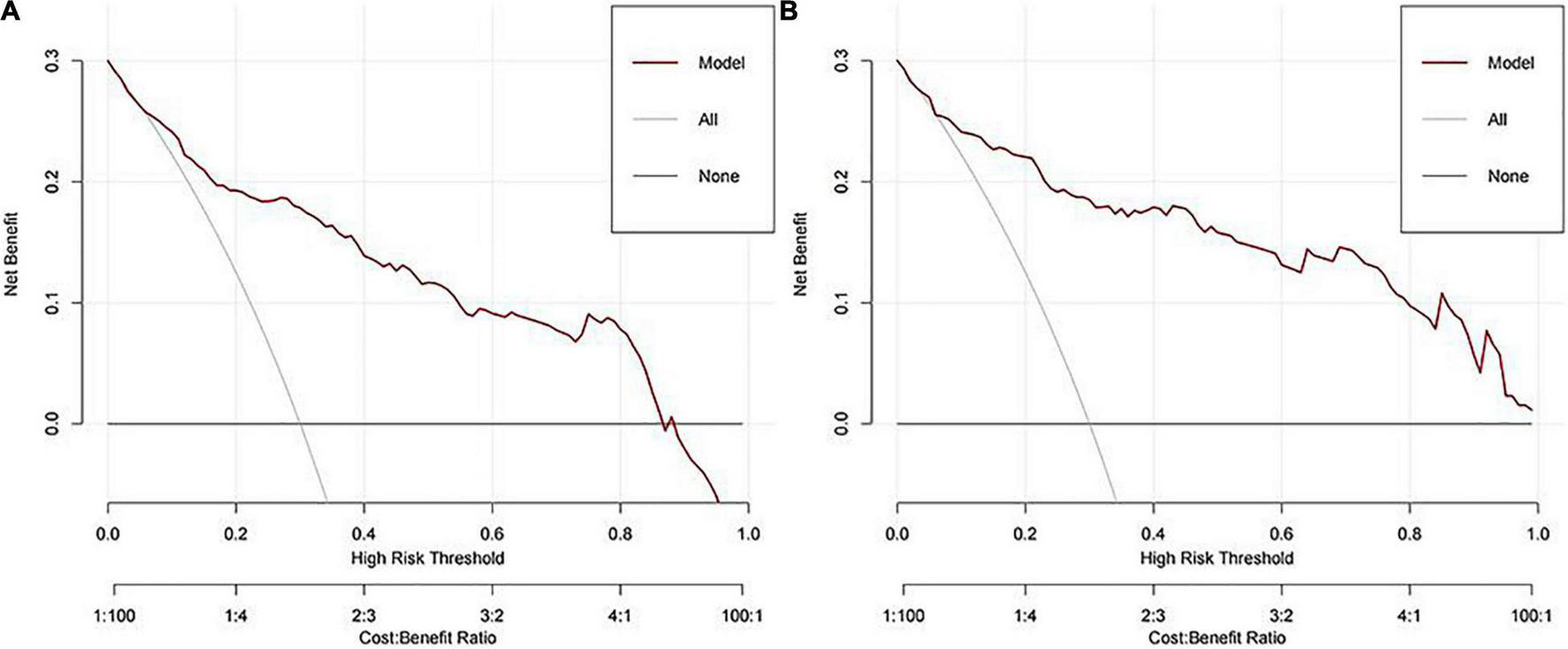 Decision curve analyses (DCA) of our model. (A) Training cohort. (B) Validation cohort.
