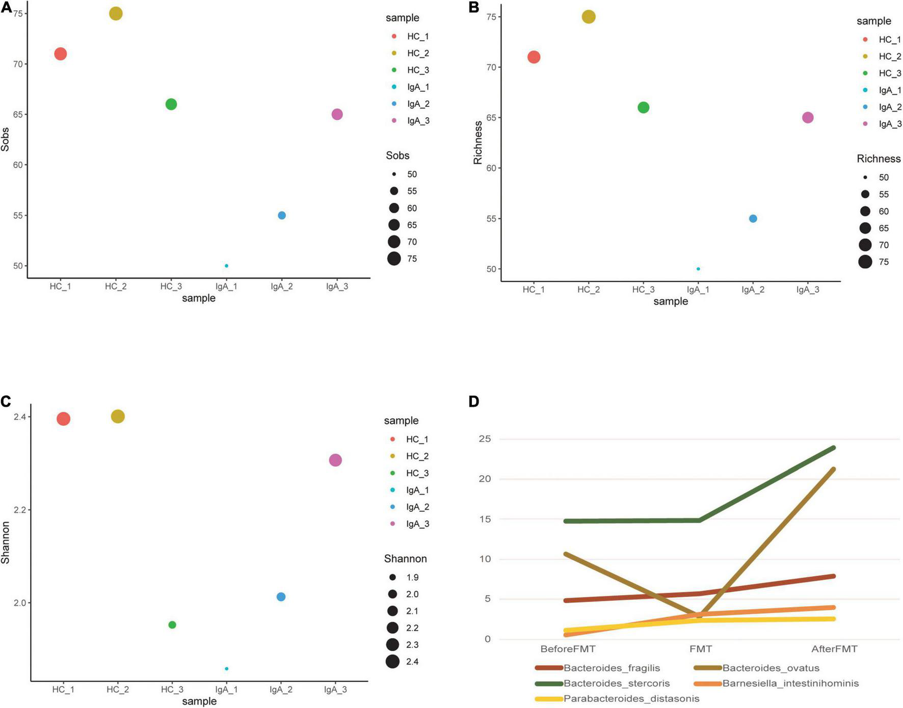 Figure 2. Changes in alpha diversity and main bacterial species before and after FMT. (A–C) Were to show the diversity of IgAN patient and healthy control in this study. (A,B) Were to reflect the Richness, and (C) was to show the Evenness. The larger the point, the larger the value is. Different color means different samples before or after FMT. (D) Was to reflect the changes of main bacterial strains.