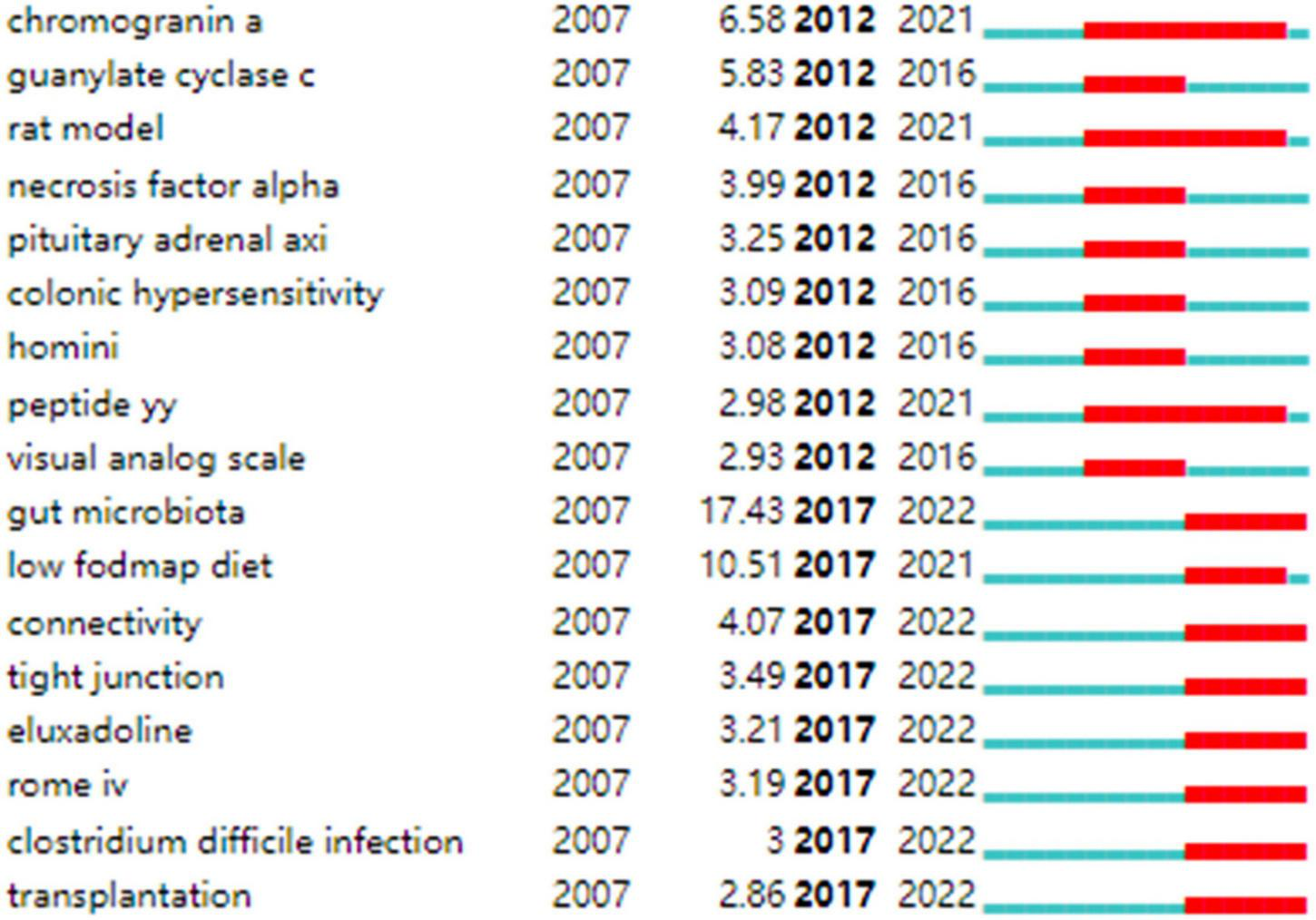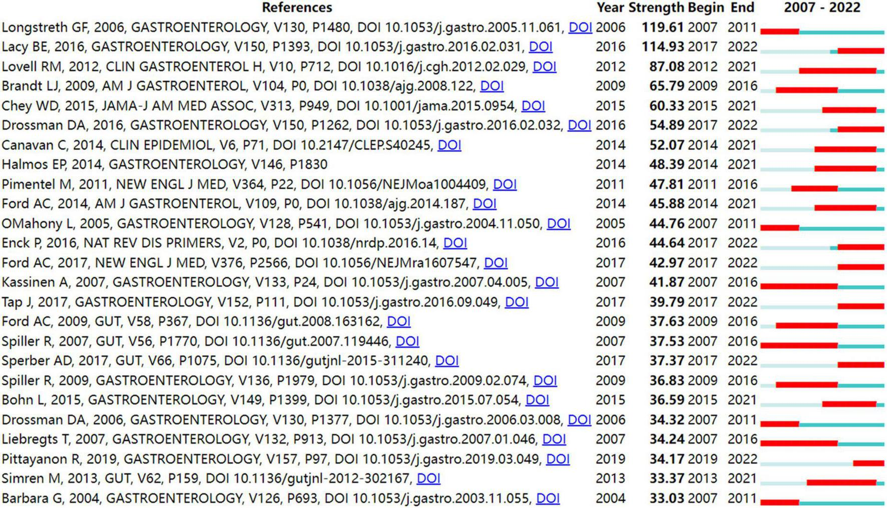 In total, 4,092 publications were reviewed. The USA led the list of countries with the most publications (1,226, 29.96%). Mayo Clinic contributed more publications than any other institution (193, 4.71%). MAGNUS SIMREN stood out as the most active and impactful scholar with the highest number of publications and the greatest betweenness centrality value. The most high-yield journal in this field was Neurogastroenterology and motility: the official journal of the European Gastrointestinal Motility Society (275, 6.72%). Gastroenterology had the most co-citations (3,721, 3.60%). Keywords with the ongoing strong citation bursts were chromogranin A, rat model, peptide YY, gut microbiota, and low-FODMAP diet, etc.