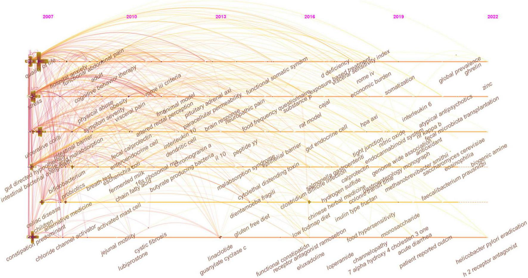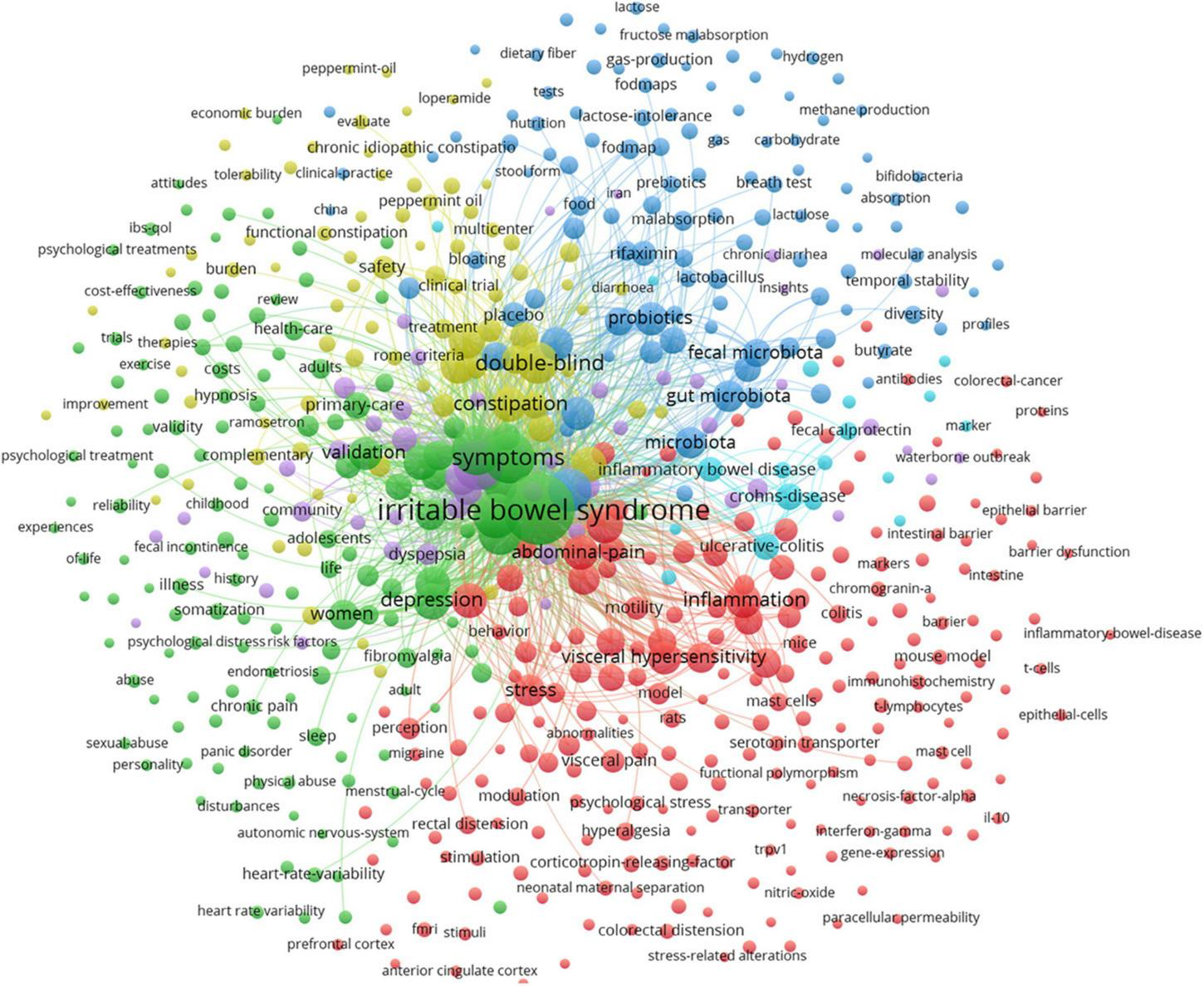 There are about 10–23% of adults worldwide suffering from irritable bowel syndrome (IBS). Over the past few decades, there are many aspects of uncertainty regarding IBS leading to an ongoing interest in the topic as reflected by a vast number of publications, whose heterogeneity and variable quality may challenge researchers to measure their scientific impact, to identify collaborative networks, and to grasp actively researched themes. Accordingly, with help from bibliometric approaches, our goal is to assess the structure, evolution, and trends of IBS research between 2007 and 2022.