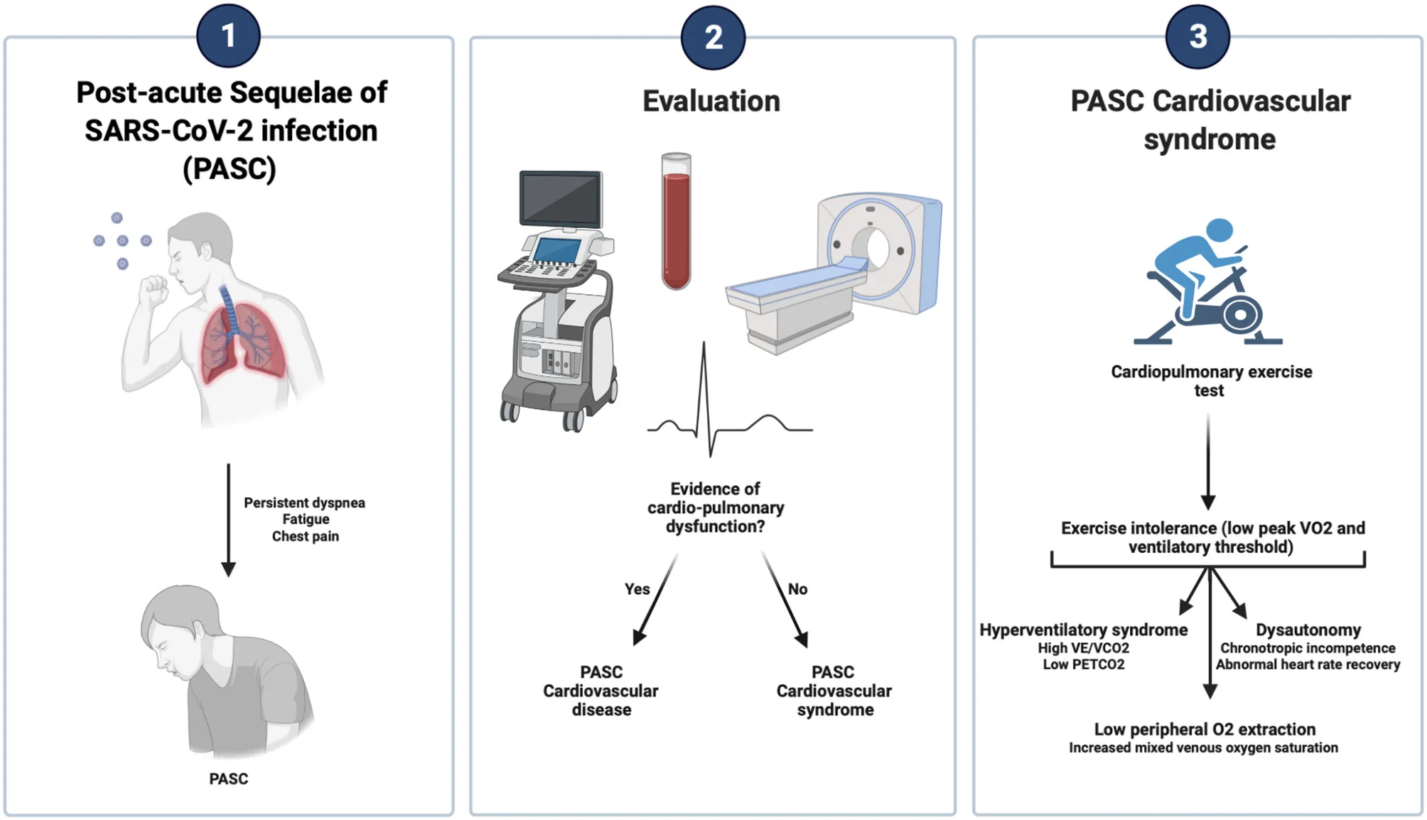 Identification of patterns during CPET may identify the organ systems involved in the exercise intolerance referred by PASC patients as we cannot rely exclusively on a decreased peak Vo2 and VT (see Graphical Abstract). Therefore, CPET can be combined with the invasive and non-invasive tests to further phenotype more accurately PASC-CVS. However, given the systemic nature of COVID-19, we may expect a cardiac, ventilatory, peripheral, and/or pulmonary gas exchange limitation at exercise.
