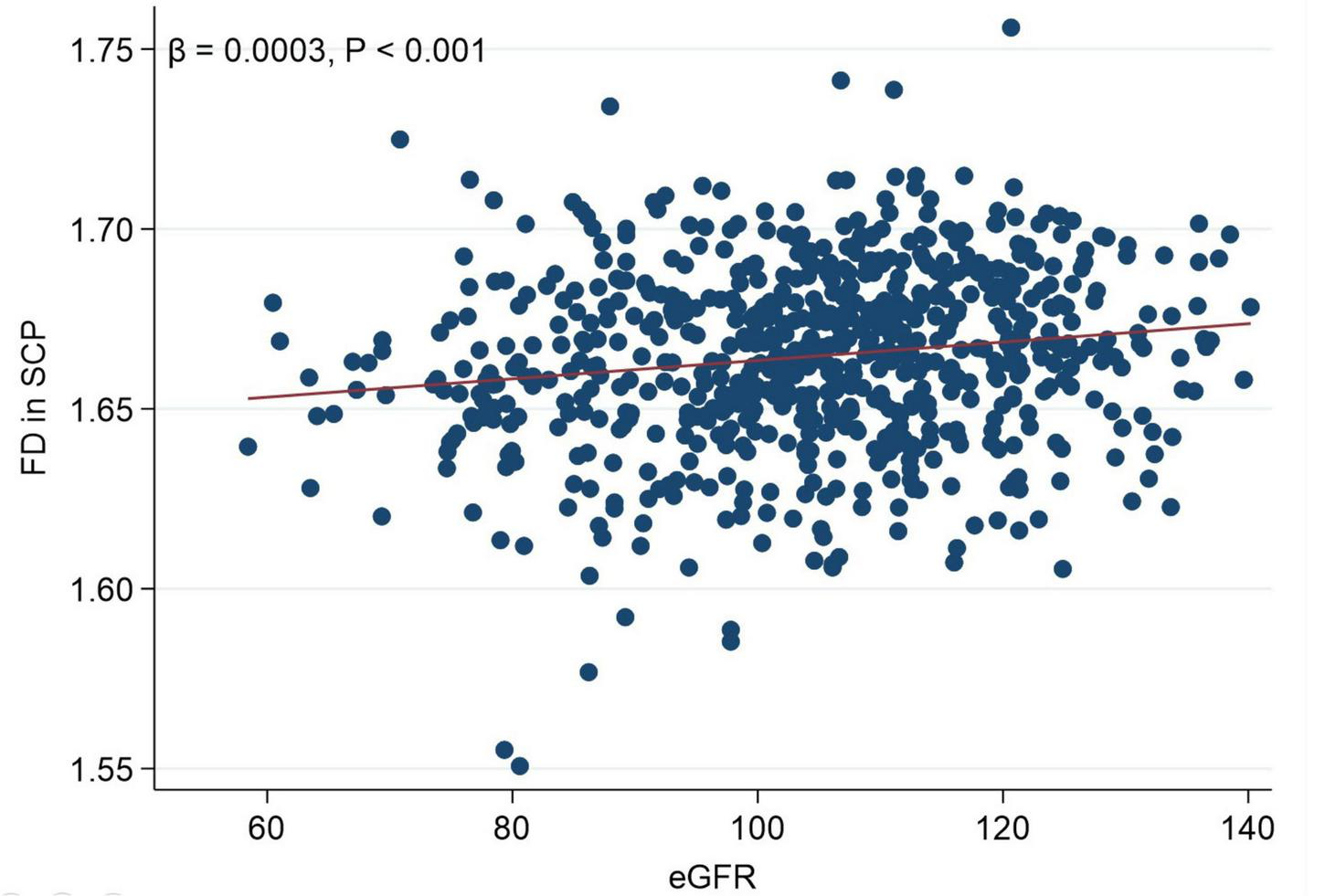 Table 4 shows the results of the multivariable linear regression of FD and BVT with eGFR, and the findings showed that FD in the SCP was still positively associated with eGFR (β = 0.2257; 95% CI 0.0829–0.3685; p = 0.002), while FD in the DCP, BVT in the SCP and DCP was not related to eGFR (all p > 0.05).
