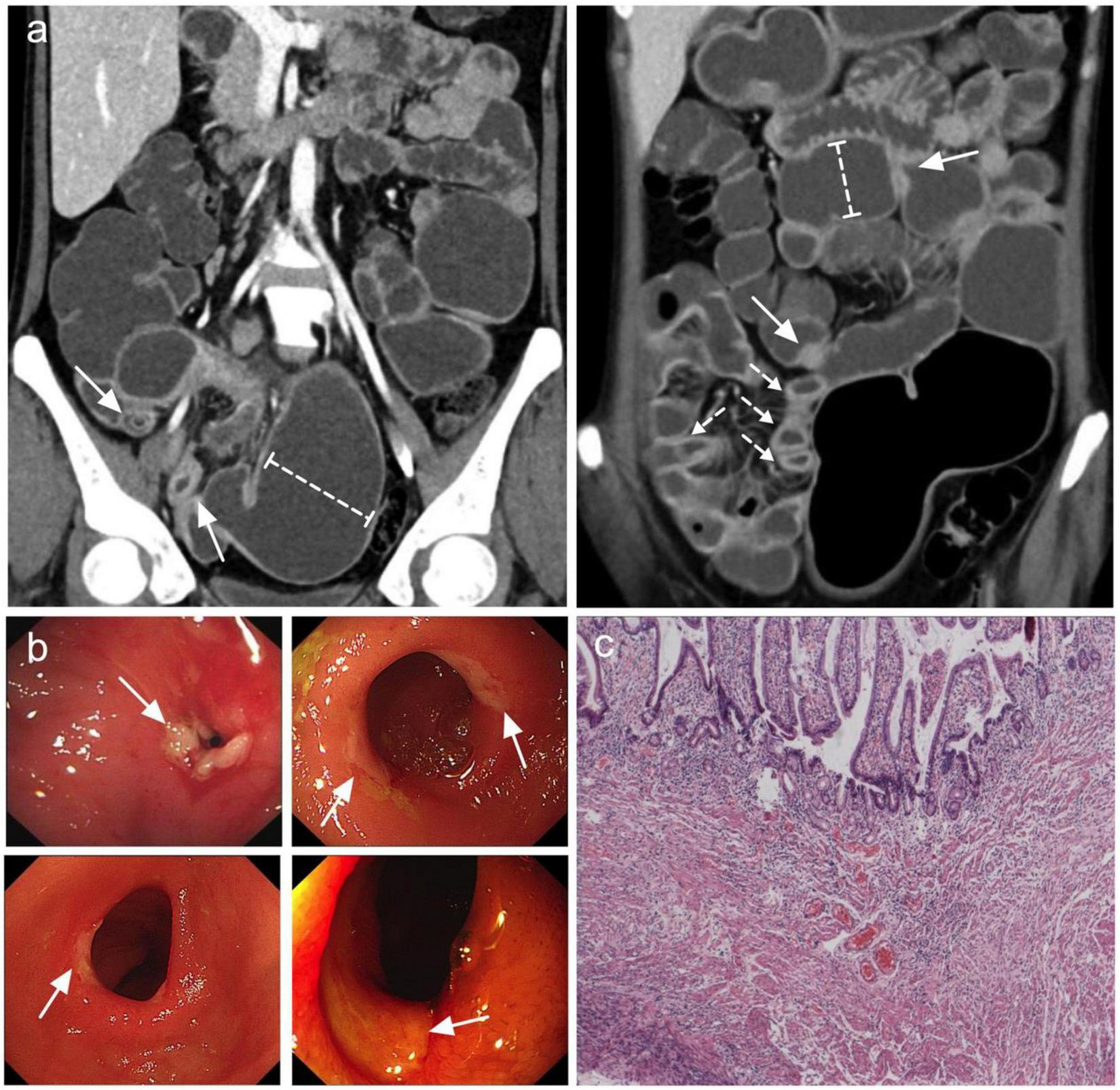 Most common features observed in CMUSE. (a) Coronal CT enterography images demonstrate multiple short strictures, with mild stratified hyperenhancement (arrows) and proximal lumen dilation (dashed-capped lines). (b) Double balloon enteroscopy demonstrates circumferential shallow ulcers in ileum or jejunum (arrows). (c) HE stain of the ileum demonstrates superficial ulcers involving mucosa and submucosa with angioectasia and congestion.