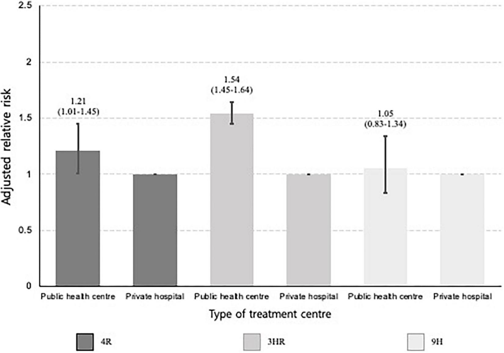 In the multivariable analysis, participants aged ≥ 65 years (aRR, 1.34; 95% CI, 1.25–1.44) were more likely not to initiate treatment, compared to those aged 20–34 years. Compared to private hospitals, public health centres (aRR, 3.72; 95% CI, 3.95–3.86) were associated with treatment non-initiation (Table 2). In a subgroup analysis of those who visited private hospitals, age under 20 was associated with a higher risk of not initiating treatment (aRR, 1.48; 95% CI, 1.26–1.74), compared to being 20–34 years old. In a subgroup analysis of those who visited public health centres, this association was reversed (aRR, 0.74; 95% CI, 0.67–0.81) (Figure 4). In both cases, the oldest age group was associated with an increased likelihood of not initiating treatment.