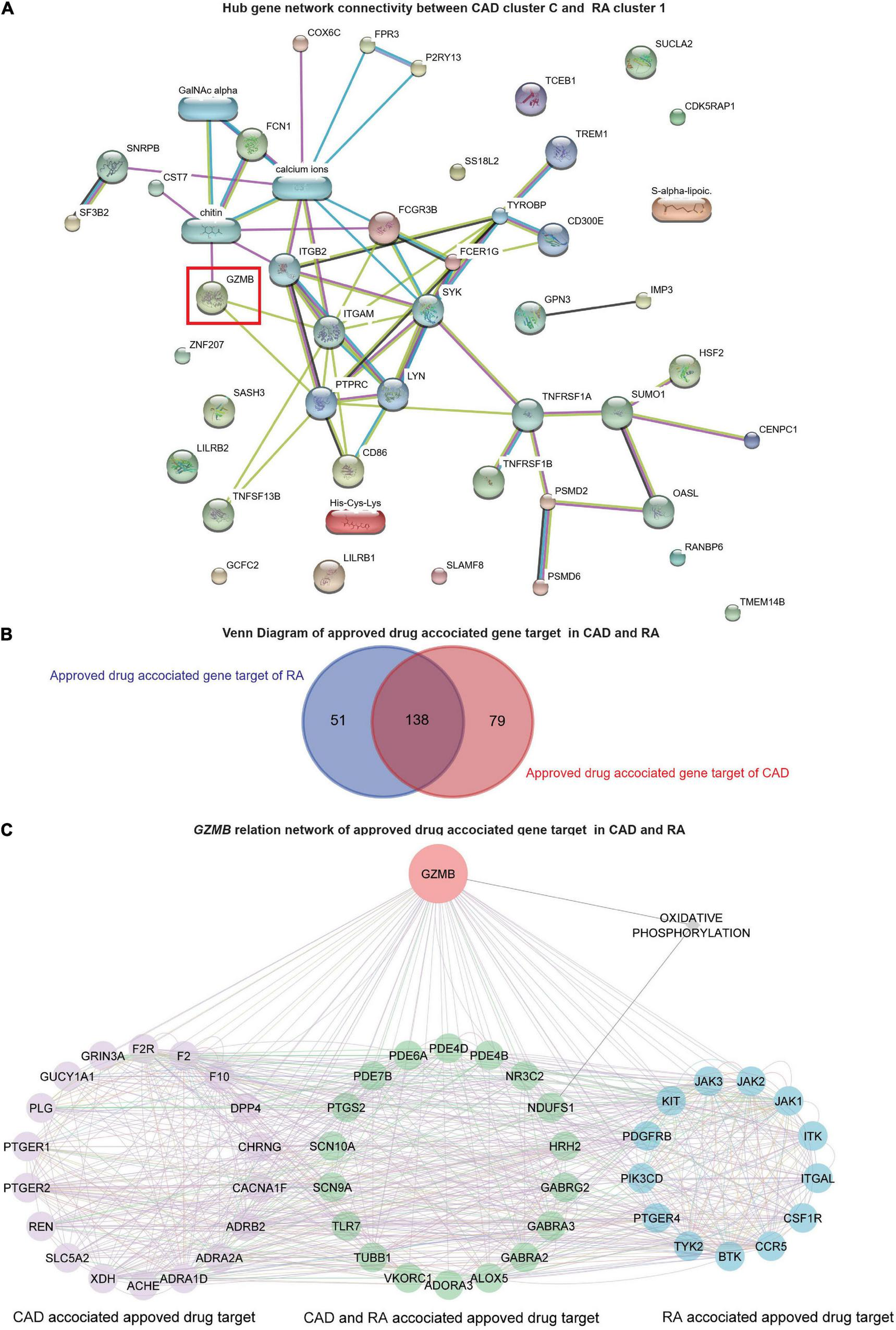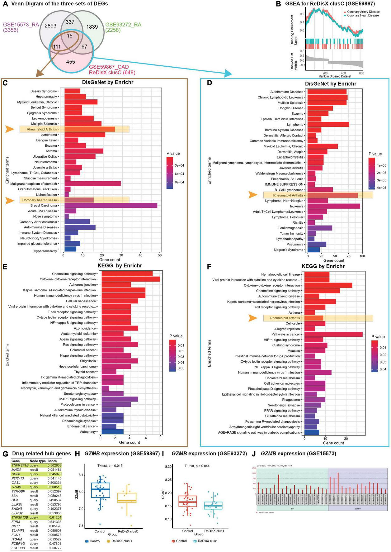 Our results revealed an enhanced differentiation capacity compared to the conventional diagnosis (Figures 2, 4). ReDisX showed distinct differentiation ability across the diversified datasets (Figures 2, 4). It showed that a subpopulation (n = 12) of patients with CAD exhibits higher gene expression similarity and functional enrichment similarity to the RA patients (Figure 5). It clustered the similar gene expression profiles of the subpopulation of CAD and RA consecutively to classify the heterogeneity within a disease. Interestingly, a hub-gene was discovered within the CAD and RA subpopulation related to the drug discovery targeting granzyme B (GZMB) (Figure 5) (25). Our analyses have endorsed GZMB as a potential target for developing drugs for those specific subpopulations of CAD and RA.