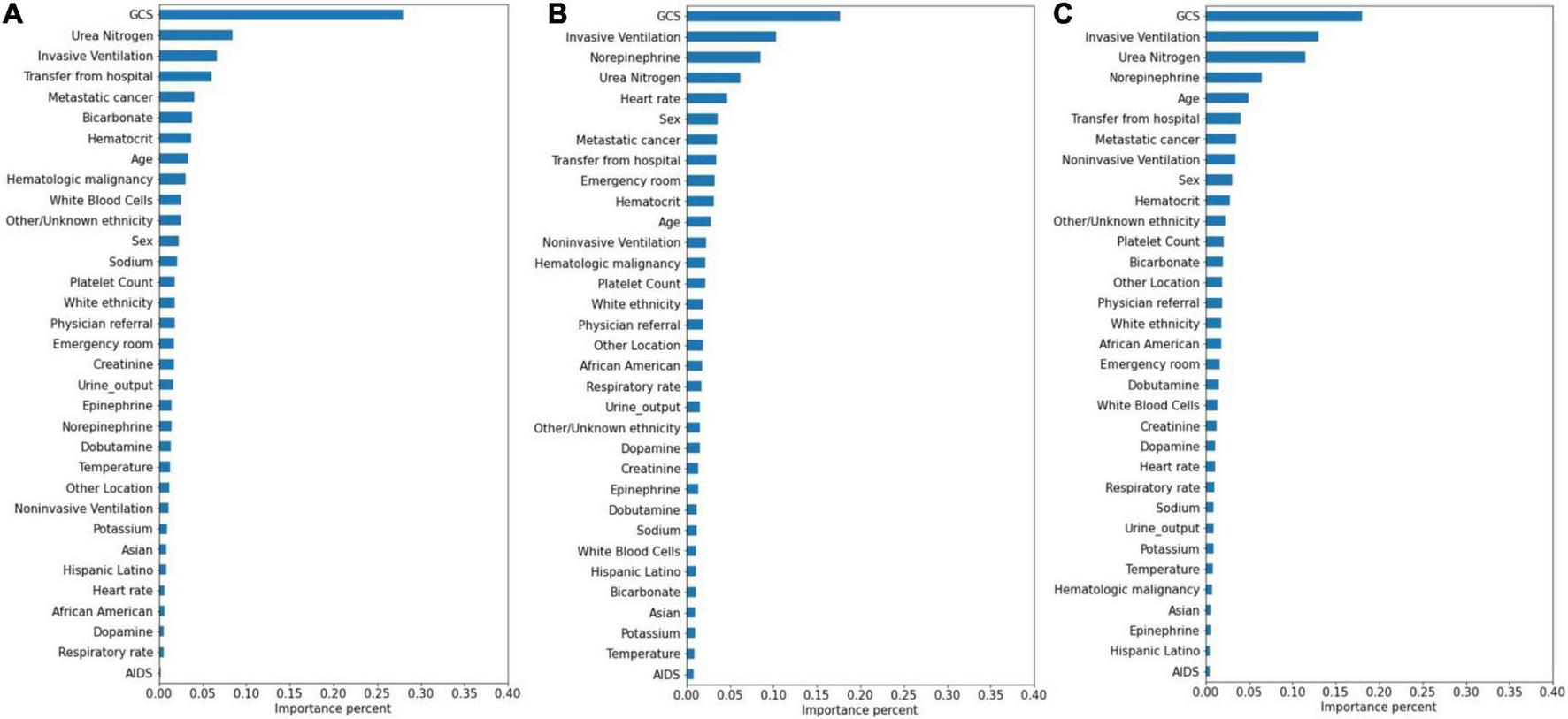 Variable importance generated by mortality prediction models. (A) RNN; (B) GRU; (C) LSTM.