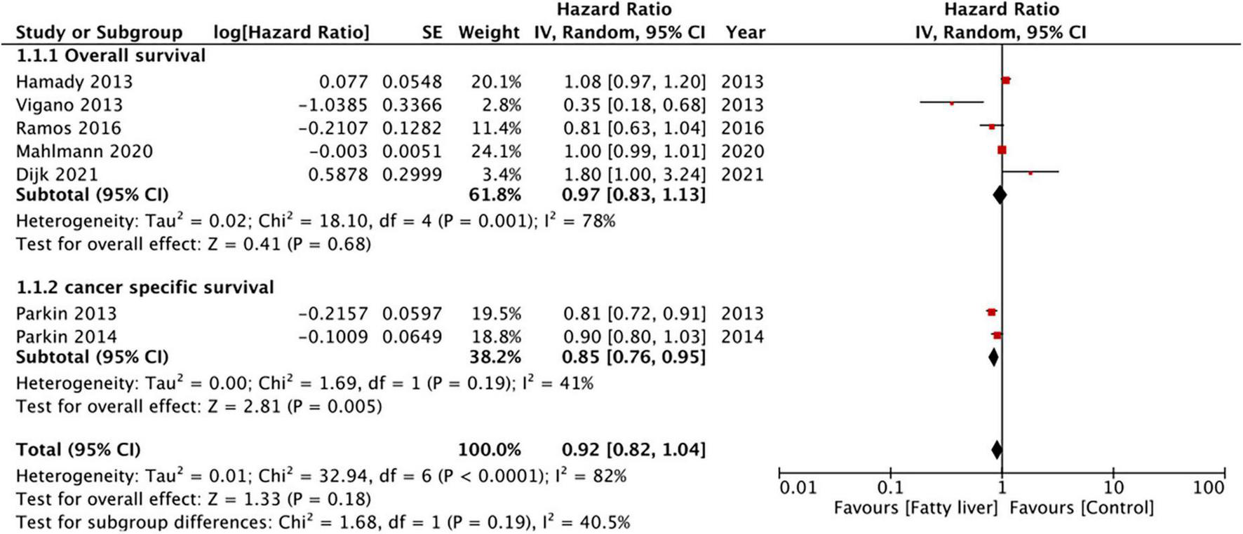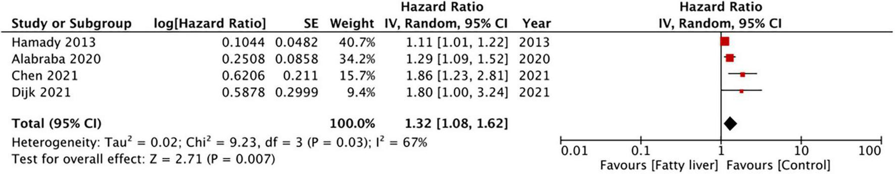 We examined the databases of PubMed, CENTRAL, Embase, Google Scholar, and ScienceDirect for studies reporting outcomes of CRLM patients with and without hepatic steatosis. We performed a random-effects meta-analysis using multivariable adjusted hazard ratios (HR).