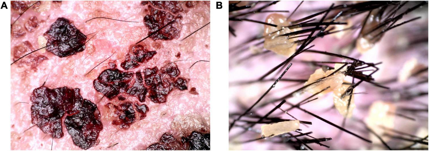 Dermoscopic pictures (A,B). A large amount of dark reddish-brown blood and yellow callus-like substances were observed on the scalp and hair under dermoscopy.