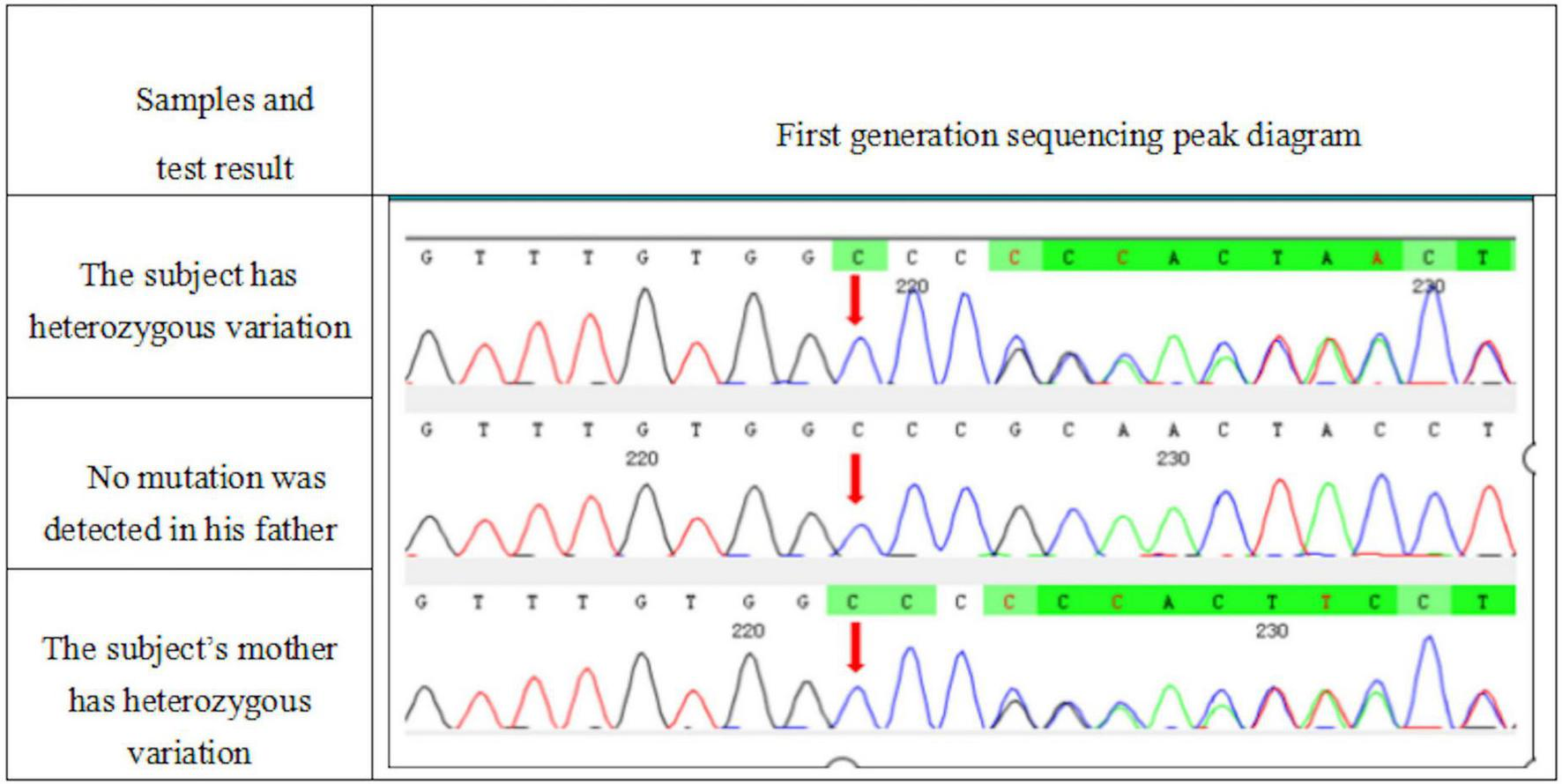 Whole exome sequencing was performed on the patient and his parents, and the results were positive, with genetic variations associated or partially associated with the clinical phenotype of the patients. Gene variation analysis was performed on the whole exome group and adjacent splice region of the family of the subject, it was found that the subject carried a heterozygous code shift variation on ATP2A2 gene, namely, c. 2962dup: p.R988Pfs *15 (Figure 5), and the results of first-generation sequencing showed that the mutation was reliable and inherited from the mother.