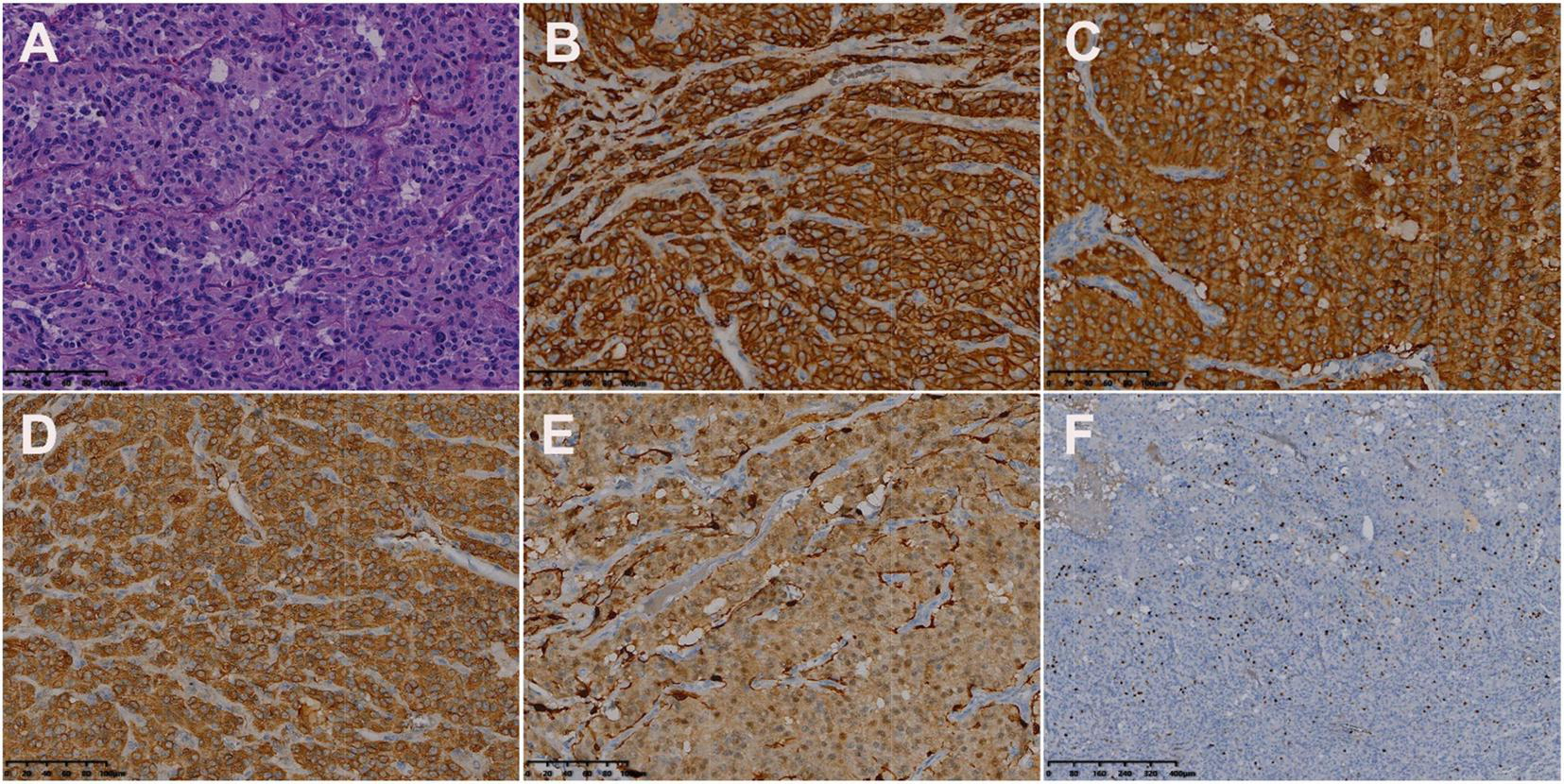 Histologic and immunohistochemical features of cardiac paraganglioma. (A) Hematoxylin-eosin (HE) staining showed that the tumor cells were polygonal, with round-like nuclei and rare nuclear fission images (magnification, ×200). In immunohistochemical staining, the tumor cells were positive for CD56 (B), SYN (C), CgA (D), and S-100 (E). Moreover, 3% of them were positive for Ki-67 (F) [magnification (B–F) ×200].