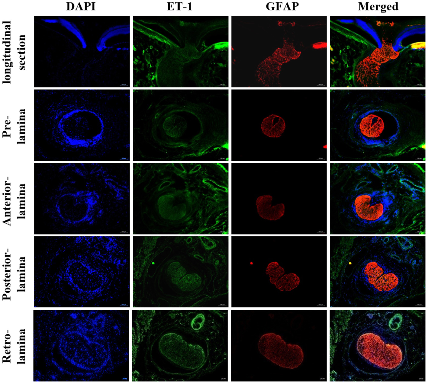 Immunofluorescent staining for ET-1 in rat LC tissues. Staining for ET-1 was mainly located in the surface layer of ONH, LC, retrobulbar optic nerve, and central retinal vessels. ONH, Optic nerve head; LC, Lamina cribrosa; ET-1, Endothelin 1.