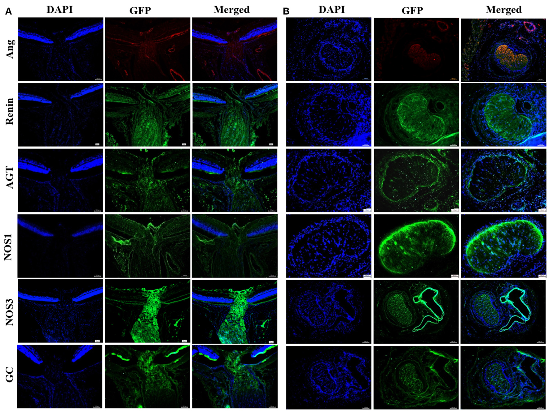 Immunofluorescent staining of NOS and RAS components in rat LC tissues. (A) Longitudinal section of LC tissue showed positive staining of Ang, renin, AGT, NOS1, NOS3, and GC. (B) Horizontal section of LC tissue showed positive staining of Ang, renin, AGT, NOS1, NOS3, and GC. LC, Lamina cribrosa; Ang, Angiotensin; AGT, Angiotensinogen; NOS, Nitric oxide synthase; GC, Guanylate cyclase.
