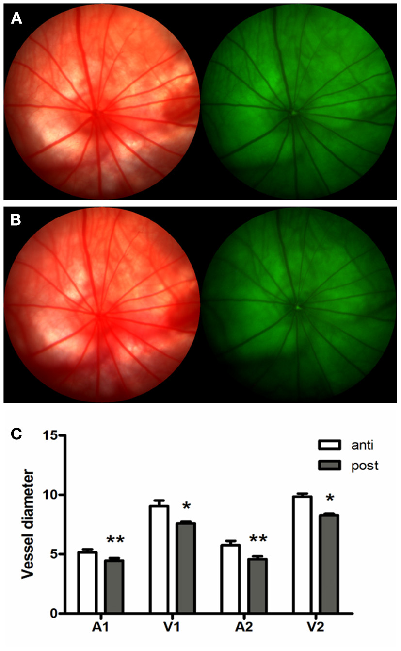 Fundus imaging and fundus fluorescein angiography (FFA) were then performed in order to evaluate the retinal vessel diameter before and after hyperoxia exposure. The SD rats were routinely anesthetized and the pupils were dilated. After intraperitoneal injection of fluorescein sodium (10%, 0.15 ml/100 g), dynamic fundus photographs were taken using a retinal imaging microscope (Phoenix Micron IV, Phoenix, USA). The diameter of retinal vessels beside the ONH edge, and at one time the optic disc diameter, was measured using Image J. One eye of each rat was randomly selected for statistical analysis. The same vessel segment was measured three times to take the average.