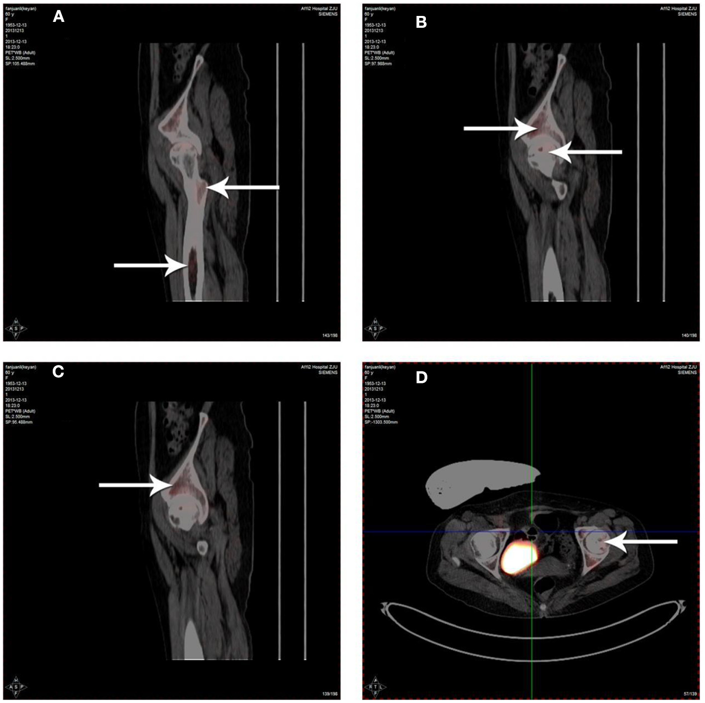 Distribution of 18F-FDG labeled PBSCs after infusion via the medial circumflex femoral artery. The 18F-FDG labeled PBSCs could be observed in the femoral bone marrow cavity (A), necrotic area of the femoral head (B,D) and acetabulum (C). The 18F-FDG labeled PBSCs could be seen in necrotic area of the femoral head indicating that PBSCs could enter into the femoral head and migrate into necrotic field of the femoral head participating in the repair of osteonecrosis after infusion through the medial circumflex femoral artery.