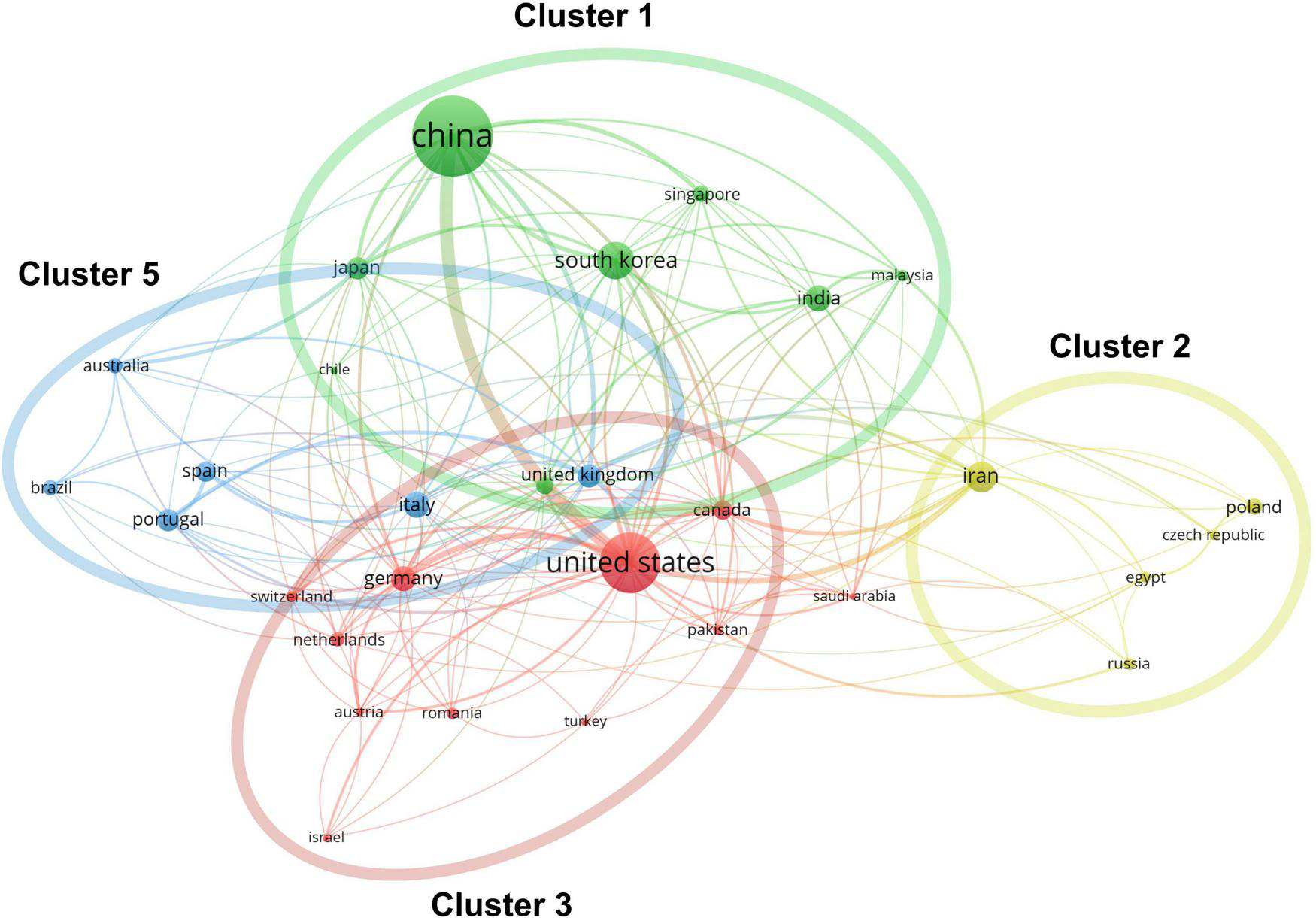 China ranked first for the number of publications at 433 (29.4%), followed by the United States at 274 (18.6%) and South Korea at 131 (8.9%; Figures 1B,C). However, regarding the H-index, the United States ranked first (59 with 15,373 citations or 31.9%), followed by China (52 with 11,575 citations or 24.0%) and South Korea (31 with 3,272 citations or 6.8%); these results are consistent with these countries’ 2020 GDP rankings. Moreover, four clusters were mapped by coauthors of countries/regions (Figure 2). Cluster 1 mainly included Western European countries/regions, such as England, France, and Netherlands. China, Iran, the United States, and Italy had the highest number of published papers in Clusters 1–4.