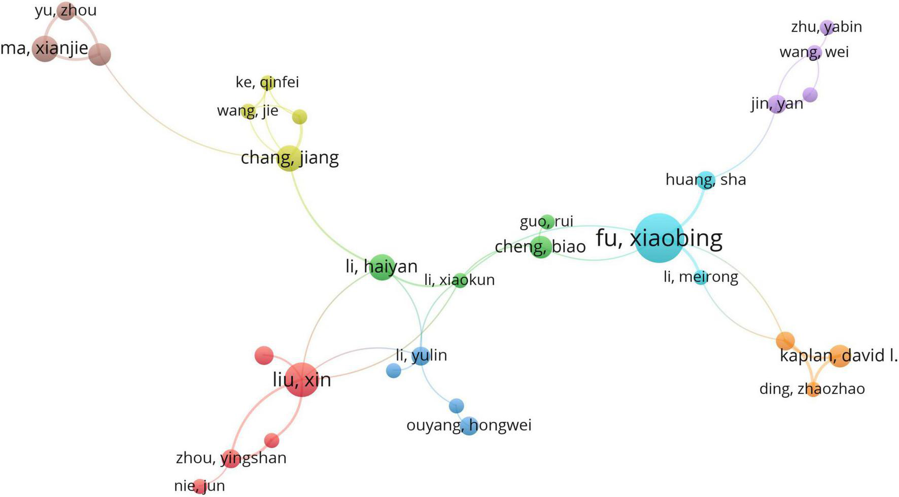 The top 10 authors wrote a total of 135 papers, accounting for 9.2% of all studies on skin regeneration. Li Qingfeng from Shanghai Jiao Tong University published 17 papers related to skin regeneration, thus ranking first in terms of the number of publications. Ramakrishna Seeram from the National University of Singapore and Fu Xiaobing from the Chinese People’s Liberation Army General Hospital ranked second and third with 15 and 14 papers, respectively. Furthermore, Lorna J. Gibson from the Massachusetts Institute of Technology had the highest citation frequency (Table 1 and Supplementary Table 1) (16–23). These highly cited articles are all basic science studies. The eight clusters of co-authorship among authors are illustrated in Figure 5; most show that Chinese authors cooperate relatively frequently.