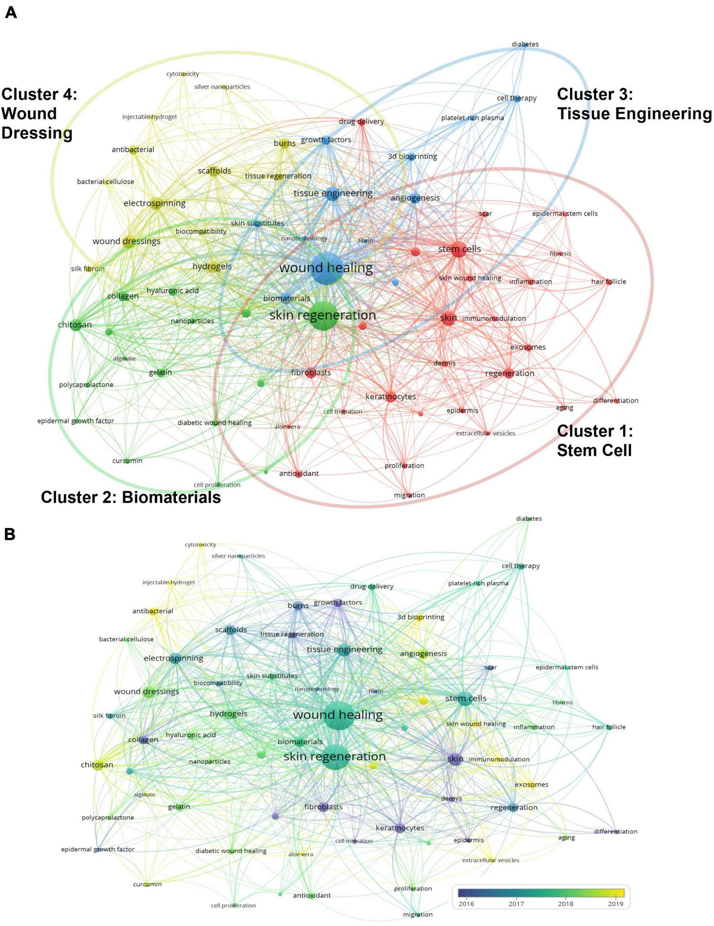 Figure 6. Analysis of keywords in publications on skin regeneration. (A) Map of the keywords concerning skin regeneration. The keywords were divided into three clusters, indicated with different colors. The large icon indicates keywords with high frequencies. (B) The keyword distribution is presented according to the average date of appearance, with blue representing an early appearance and yellow indicating a recent appearance. The smaller the distance between two keywords, the greater the frequency of their co-occurrence. Minimum number of occurrences of one keyword: 7.