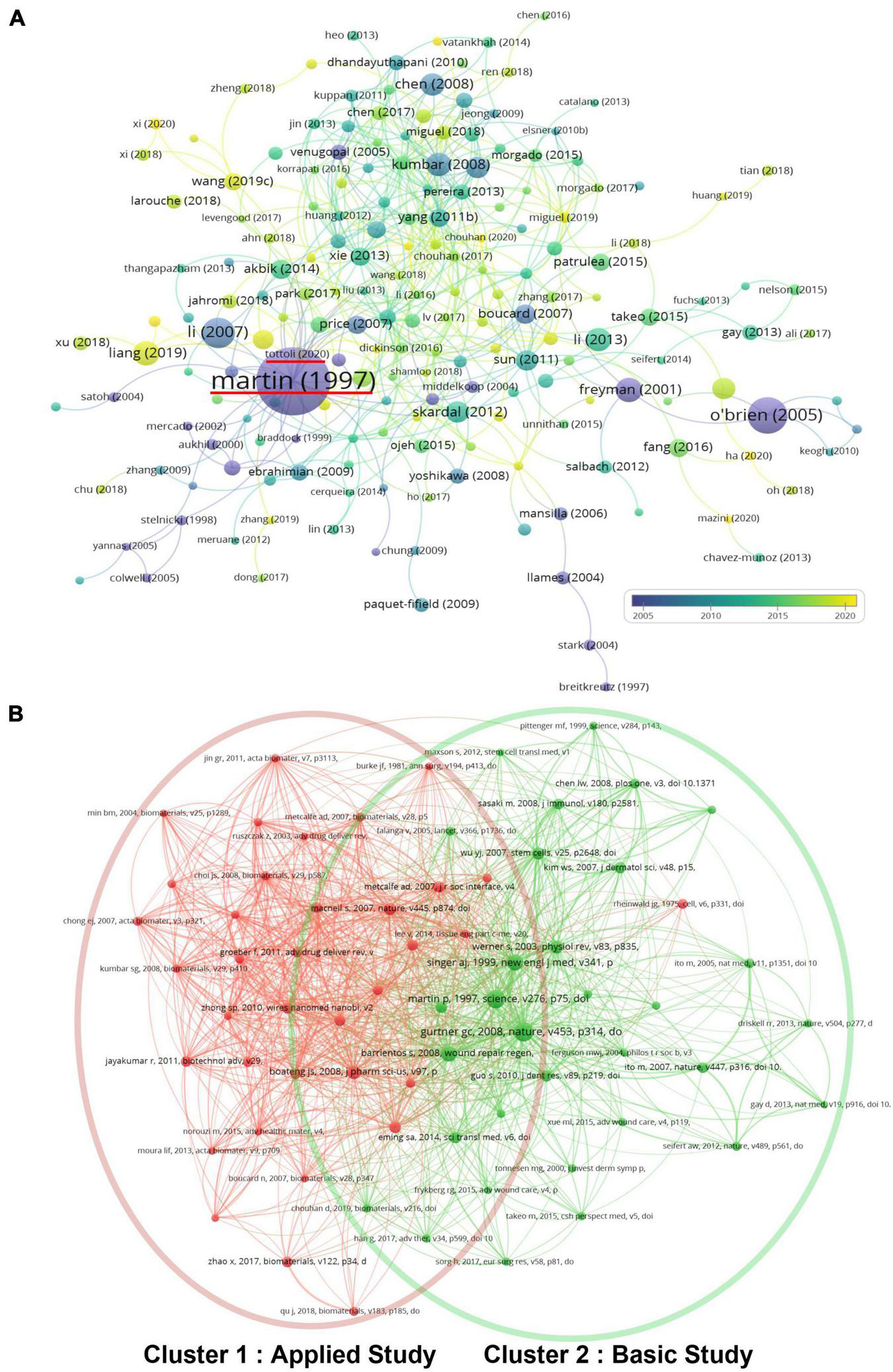 Figure 7. Citation and co-citation analysis of papers on skin regeneration. (A) Citation map; the distribution of publications is presented according to the average date of appearance, with blue representing an early appearance and yellow indicating a recent appearance; the red horizontal line indicates the most cited articles and the most cited articles among the latest articles; minimum number of times a paper was cited: 50. (B) Co-citation map; the publications were divided into three clusters in accordance with different colors. The large icon indicates publications with high frequencies; minimum number of citations of one document: 25.