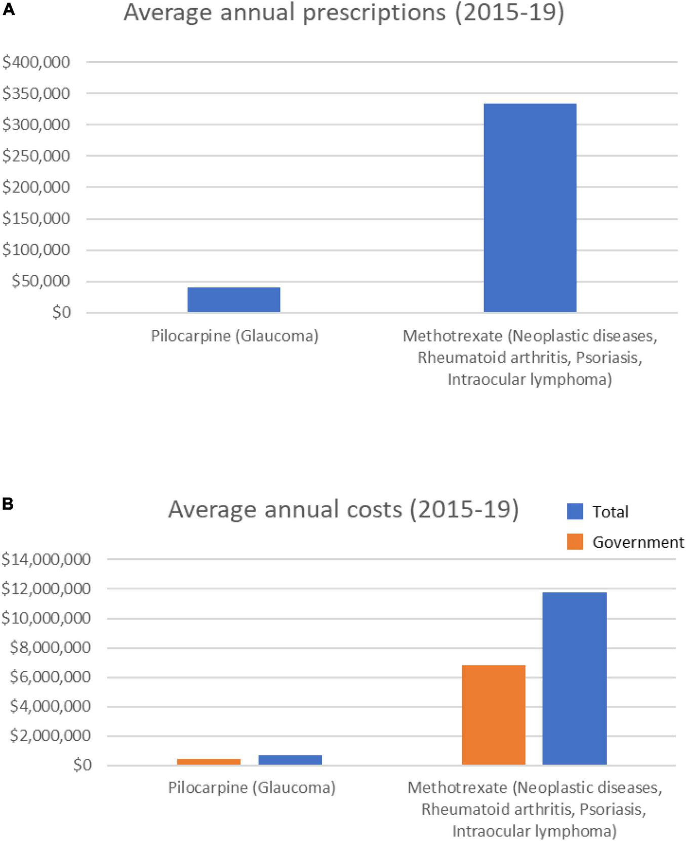 Of the 9 drugs classified as having a probable association with cataract formation (Supplementary Table 1), only two were prescribed over the 5-year period analyzed–methotrexate and pilocarpine (Table 2). These drugs are prescribed for conditions including cancer and rheumatoid arthritis (methotrexate), or glaucoma (pilocarpine). Methotrexate averaged > 330,000 annual prescriptions (Figure 2), with prescriptions increasing ∼28% over the 5 years (from 298,589 in 2014/15 to 398,799 in 2018/19). Average methotrexate costs were > $11 M/yr (Figure 2), having increased 49% over the 5 years ($9.9M to $14.7M; Supplementary Figure 2). In contrast, pilocarpine, averaged > 40,000 prescriptions/year at an average annual cost of $677,000/year (Figure 2). The prescribing rate for pilocarpine steadily decreased over the 5 years (Supplementary Figure 2).