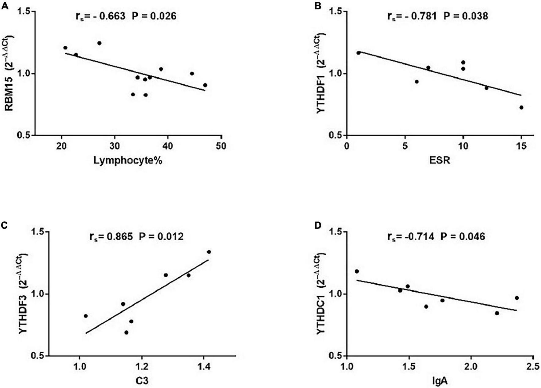 To find out whether the mRNA levels of m6A-related genes in PBMCs from patients with pSS could be indicative of disease activity, clinical manifestations and laboratory findings such as ESR, CRP, C3, C4, IgG, IgA, IgM, rheumatoid factor, anti-SSA antibody, anti-SSB antibody, ANA, WBC, RBC, HGB, PLT, lymphocyte, lymphocyte%, monocyte, monocyte%, neutrophil, neutrophil%, disease duration, and ESSDAI score were collected. Then, we performed a correlation analysis between the clinical characteristics patients with pSS and the mRNA levels of m6A-related genes in PBMCs from patients with pSS. As shown in Figure 4, the expression of METTL3 (rs = 0.4525, P = 0.0106), RBM15 (rs = 0.3441, P = 0.0463), FTO (rs = 0.3942, P = 0.0143), YTHDF1 (rs = 0.4072, P = 0.0255), YTHDF2 (rs = 0.3703, P = 0.0203), YTHDC1 (rs = 0.4162, P = 0.0094), and YTHDC2 (rs = 0.6208, P < 0.0001) was all positively correlated with the level of serum CRP level. Interestingly, there was a negative correlation between YTHDF1 mRNA level and ESSDAI score (rs = −0.378, P = 0.033) (Figure 4G). The expression of METTL3 also had positive associations with serum IgA level (rs = 0.3581, P = 0.0407), WBC (rs = 0.3857, P = 0.0266), and neutrophil (rs = 0.3496, P = 0.0416). Moreover, we discovered that the mRNA levels of FTO, YTHDC1, and YTHDC2 were positively correlated with WBC, lymphocyte, monocyte, neutrophil, and age of patients with pSS. In addition, although the mRNA level of WTAP in pSS and HCs did not differ significantly, it was positively associated with monocyte (rs = 0.3558, P = 0.0457) and ANA (rs = 0.4489, P = 0.0166). In addition, the expression of METTL3, WTAP, RBM15, ALKBH5, FTO, YTHDF1, YTHDF2, YTHDF3, YTHDC1, and YTHDC2 in PBMCs of patients with pSS did not correlate with disease duration, ESR, IgG, IgM, C3, C4, anti-SSA antibody, anti-SSB antibody, anti-Ro-52 antibody, RBC, HGB, or PLT (data not shown). Taken together, the expression of METTL3, RBM15, FTO, YTHDF1, YTHDF2, YTHDC1, and YTHDC2 was positively linked with inflammation markers and might reflect the disease activity of pSS.