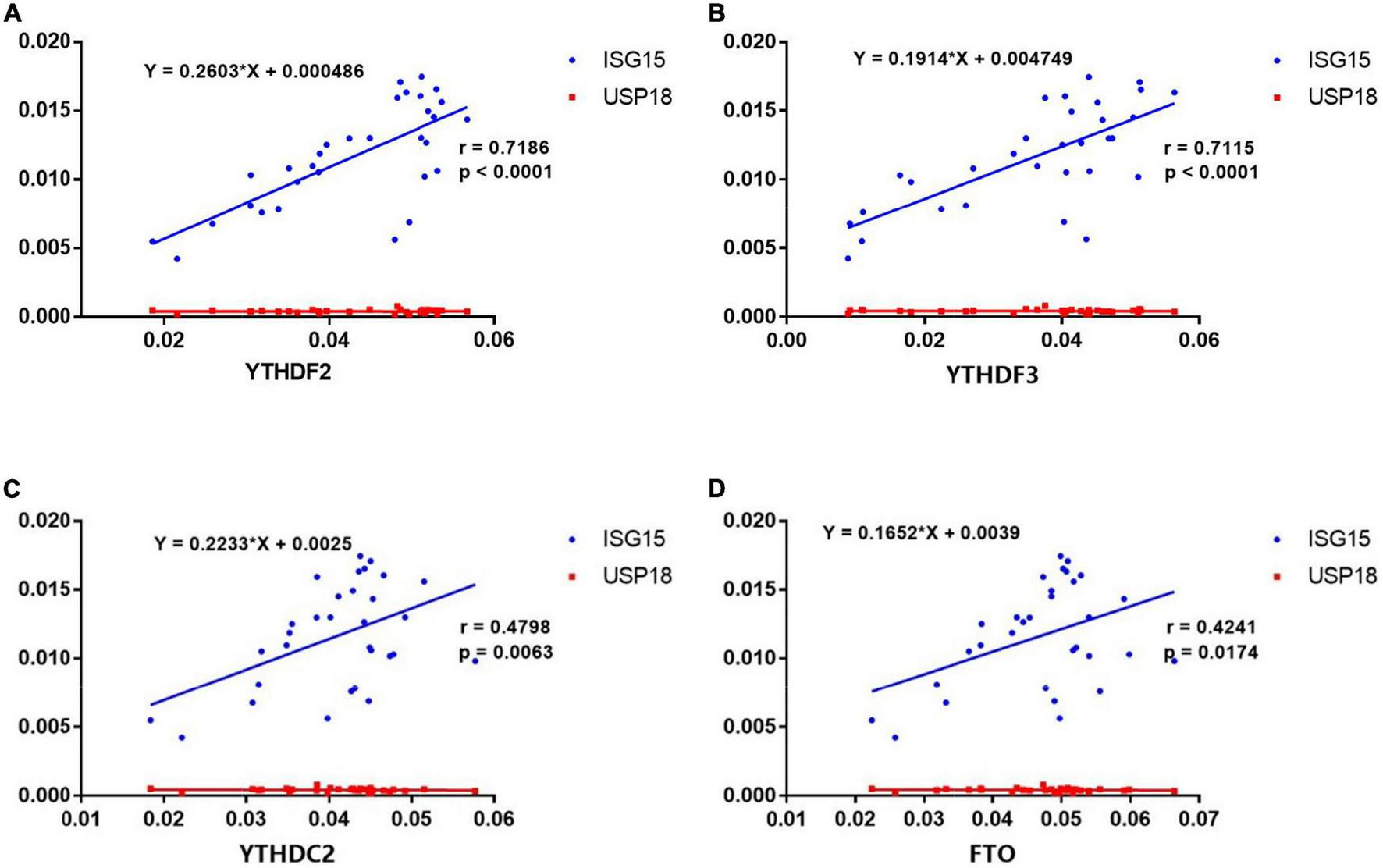Complementary DNA (cDNA) was generated from the reverse transcription of the total RNA using a Bestar™ qPCR RT Kit (DBI Bioscience, Ludwigshafen, Germany). The cDNAs were processed by Bestar® SybrGreen qPCR Master Mix (DBI Bioscience, Ludwigshafen, Germany) and LightCycler® 480 (ABI, Foster City, CA, USA). We used β-Actin as an internal control. The data were analyzed using the 2–ΔΔCt method. The sequences of amplification primers for METTL3, WTAP, RBM15, ALKBH5, FTO, YTHDF1, YTHDF2, YTHDF3, YTHDC1, YTHDC2, ISG15, USP18, and β-Actin are listed in Table 2. The m6A writers, erasers, and readers used in this study were listed in Supplementary Table 2.