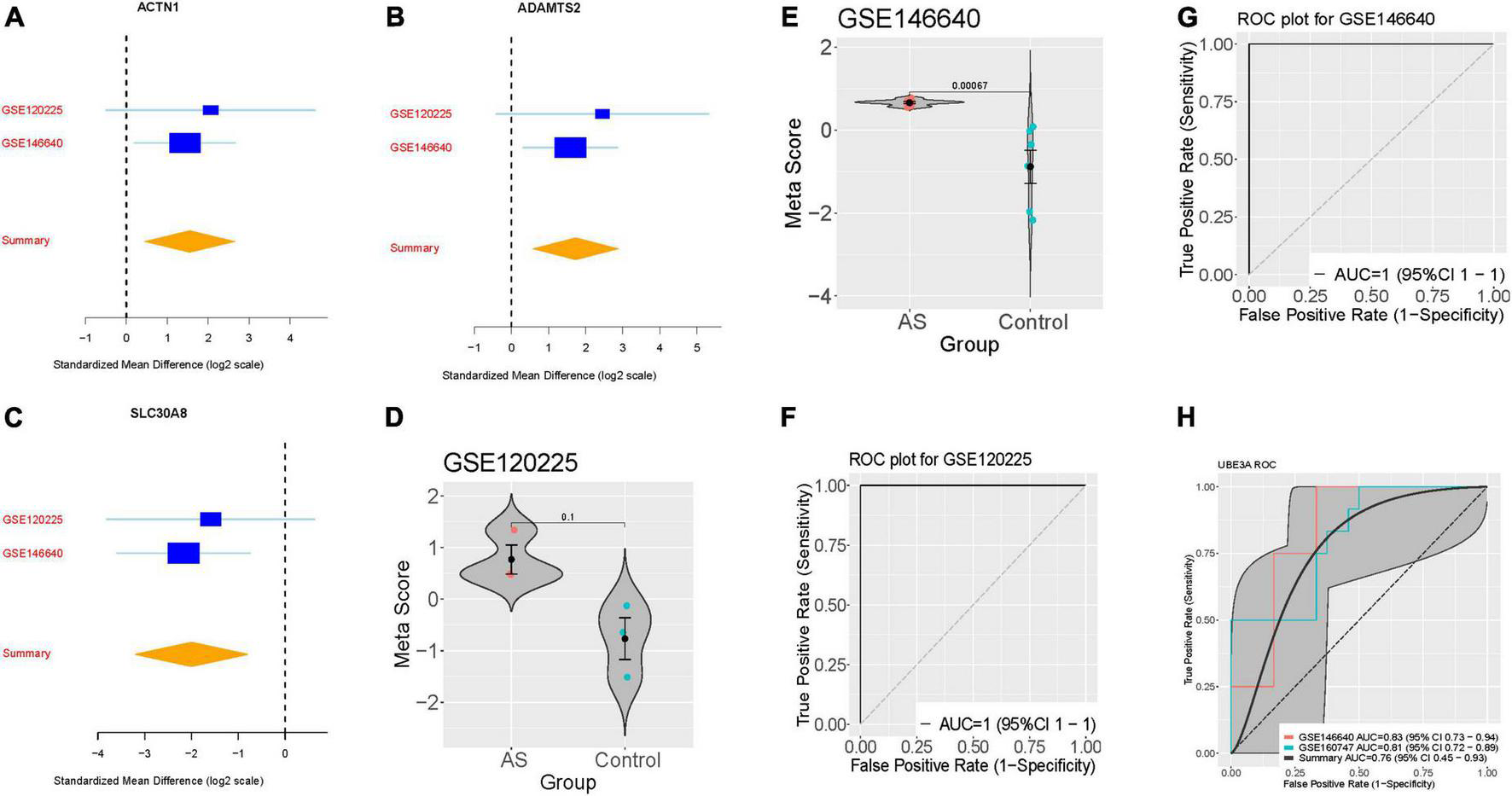 Validation of three differentially expressed genes diagnosis of AS. (A–C) The up-regulated gene (ACTN1) and down-regulated genes (ADAMTS2, and SLC30A8) searches in GSE120225 and GSE146640. The x axis represents standardized mean difference between AS and dengue control. (D,E) violin plot illustrating the meta-score of the three differentially expressed genes for differentiate AS from Control in GSE120225 and GSE146640. (F,G) ROC curves of patients with AS vs. controls in GSE120225 and GSE146640. (H) ROC curves of UBE3A diagnostic power in the training and validation dataset.