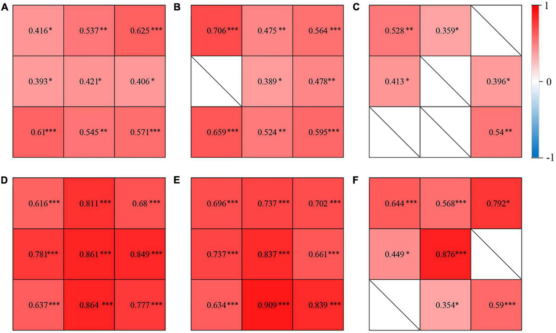 Correlations of CVI and vascular density of the large choroidal vessel layer in the eyes with central serous chorioretinopathy (CSC) (A), the fellow eyes of CSC (B), and control eyes (C). Correlations of CVI and choroidal thickness (CT) in the eyes with CSC (D), the fellow eyes of CSC (E), and control eyes (F). The correlation coefficient was represented as the value in 9 subfields. ∗P< 0.05; ∗∗P < 0.01; ∗∗∗P < 0.001.