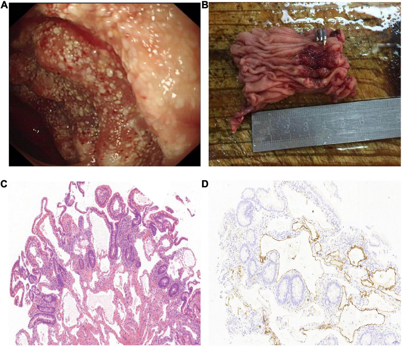 Figure 1. Surgically resected lymphangioma of jejunum due to gastrointestinal bleeding. (A) An irregular protuberant lesion of 5.0 cm × 6.0 cm in the upper segment of the ileum, with white-colored spots on the surface. (B) Photograph of segmental ileal resection, including the lymphangioma lesions. (C) Morphology showing that the lesions were composed of variably sized cysts in the mucosal lamina propria and submucosa, and the lumen was filled with lymphatic fluid (hematoxylin–eosin staining, 10× magnification). (D) D2-40 immunostaining shows positive reactivity for the endothelial cells lining the lymphatic spaces in the muscular layer (10× magnification).