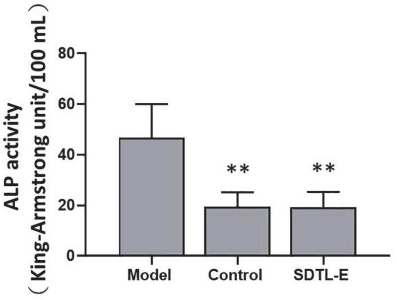 SDTL-E treatment reduced serum ALP activity of OVX-induced osteoporosis rats. Model Group (n = 11) and Control Group (n = 10) rats were treated with vegetable oil. SDTL-E Group (n = 10) rats were treated with SDTL-E. All treatments were topically applied twice daily for 20 days. Serum ALP activities were determined by ALP assay. Values are mean ± SD. **p < 0.01 vs. Model Group.